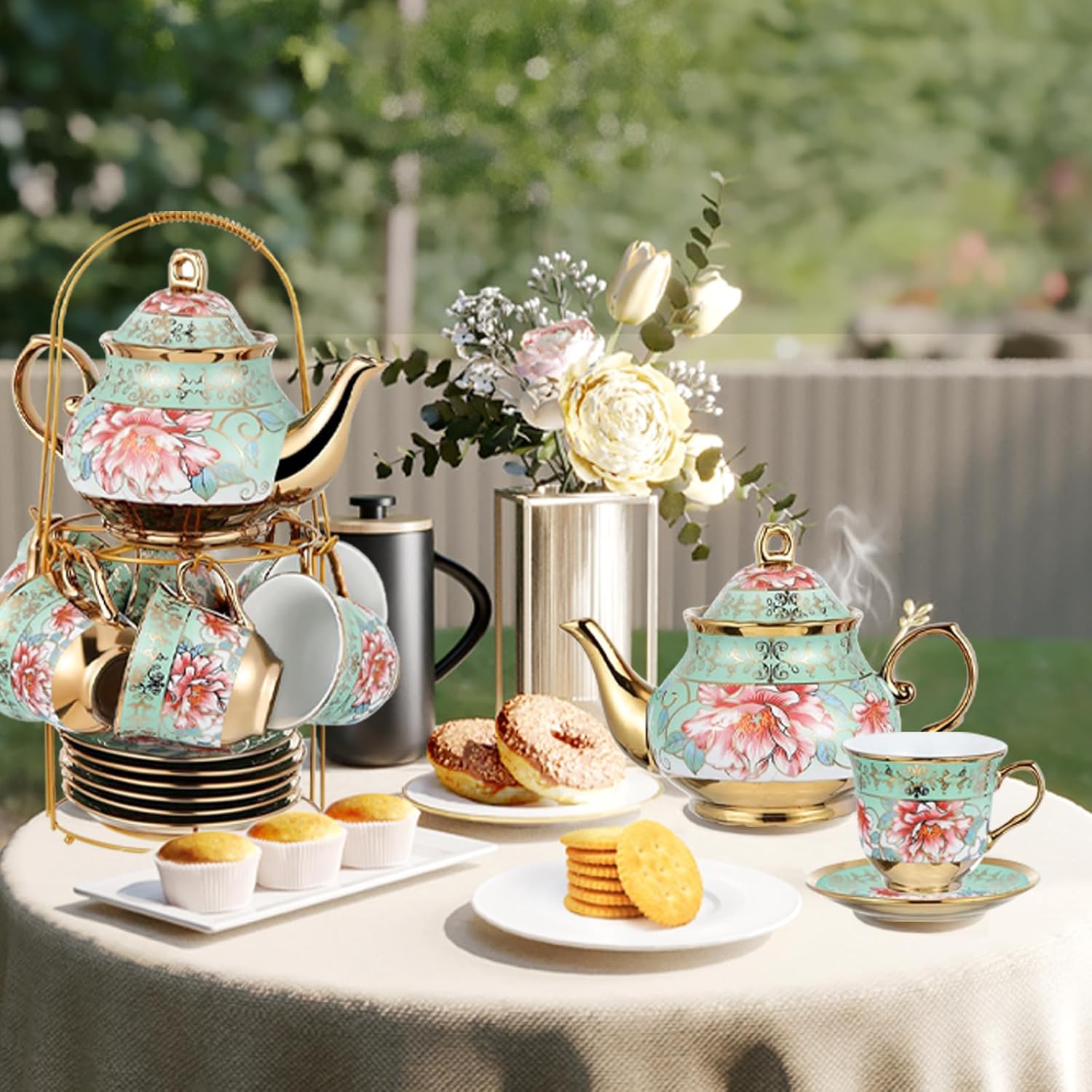 Kytree 20Pcs Porcelain Tea Set – Elegant, European-Inspired & Gift-ReadyElevate your tea moments with this exquisite purple floral ceramic set, blending vintage European charm and modern functionality. Its intricate gold-accented design and premium porcelain construction transform afternoon tea, casual gatherings, or formal parties into luxurious rituals.Why Choose Kytree Tea Set?Luxury Porcelain Craftsmanship: Made from high-quality, fade-resistant porcelain, this set withstands daily use. Vibrant floral patterns are kiln-baked for lasting brilliance, paired with a smooth, chip-resistant finish.Timeless Vintage Aesthetic: Rich purple hues and gold trim evoke classic European elegance, complemented by a 12” (30.5 cm) two-tier metal stand for sophisticated display.Complete Entertaining Kit: Includes a 15oz (450ml) teapot, six 3oz (90ml) cups with saucers, six spoons, and a tiered stand—perfect for serving tea, coffee, or fruit infusions.Thoughtful Functional Design: Teapot spout does not drip when pouring; ergonomic cup handles and saucers prevent spills. Lightweight yet durable for indoor or outdoor use.Unforgettable Gifting: Expertly packaged, this set is ideal for tea enthusiasts, housewarmings, bridal showers, or anyone who appreciates artisanal craftsmanship.SpecificationsMaterial: Premium porcelain with gold metallic accentsCapacity:Teapot: 23.67oz (700ml)Cups: 5.4oz (160ml) eachSize:Teapot: 7.87 H × 5.9” W (20 × 15 cm)Cups: 3” H × 2.5” D (7 × 6.5 cm)Saucers: 4.92” D (12.5 cm)Stand: 12.2” H x 5.51” D (31 x 14 cm)Spoons: 5.12” L (13 cm)Weight: 5.5lb/2.5kgColor: Green with floral motifs and gold trimIncludes1x Ceramic Teapot6x Ceramic Tea Cups6x Matching Saucers6x Stainless Steel Spoons1x 2-Tier Gold Metal Stand