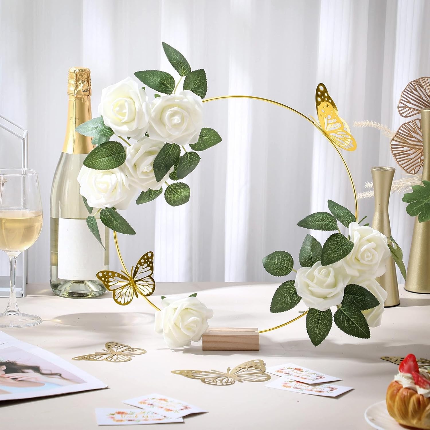 Features: Unique Design: The hoop centerpiece with stand is elegantly designed to create a charming beauty, and is equipped with rich materials, allowing you to fully experience the fun of handicrafts Wide Range of Applications: The hoop centerpiece table decorations set is suitable for your DIY decoration projects, it is suitable for wedding decorations, parties, anniversaries, baby showers or home decorations to create a romantic and warm atmosphere Specifications: Material: hoop: metal base: pine wood flower: PE foam leaves: silk cloth butterfly: cardboard Size: wreath ring: 11.8 inches/30 cm in diameter wooden base: 2.7 x 1.6 x 0.8 inches/7 x 4 x 2 cm rose head: 3 inches/7.5 cm butterflies: 4.7 inches/12 cm, 3.9 inches/10 cm, 3.1 inches/8 cm Color: hoop: gold rose: white Package Included: 6 x metal floral hoop 6 x wooden base 50 x flower 12 x butterfly