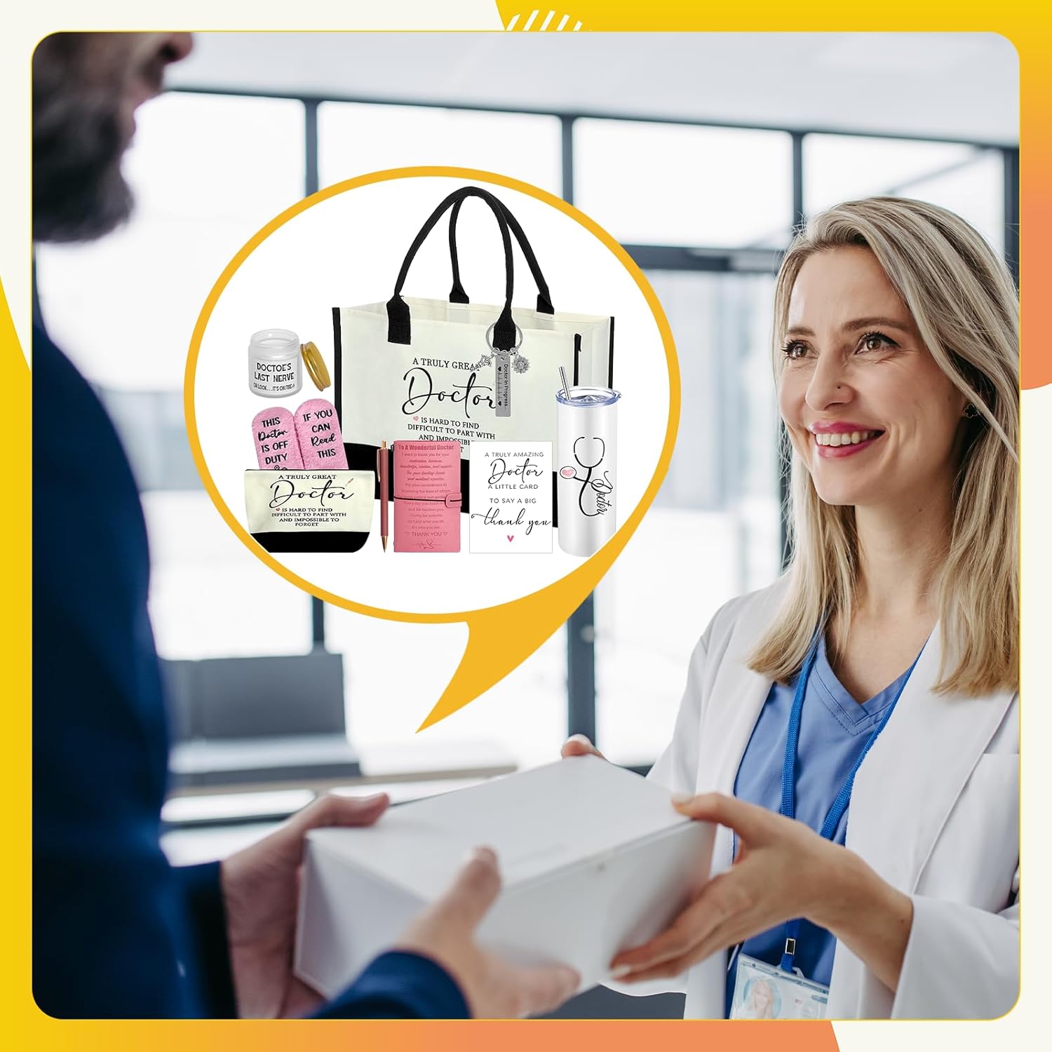 Features:This doctor gift set is comprehensive, practical, and features a warm style. It expresses respect and care for doctors' hard work and has high commemorative and long-term use value. It's the perfect gift for doctors on special occasions.Specification:Material: Tote bag and cosmetic bag: CanvasNotebook and greeting card: PaperKeychain and tumbler: Stainless steelPen: PlasticAromatherapy: Soybean oilSocks: Coral fleeceColor: MulticolorSize:Stainless steel thermos mug size: 2.95 x 8.27 inches / 7.5 x 21 cm, 20 OzCosmetic bag:8.46 x 7.48 inches/21.5 x 19 cmTote bag:11.81 x 16.9 inches/30 x 43 cmNotebook:7.87 x 4.72 inches/20 x 12 cmPen:5.5 inches/14 cmPackage included: 1 x Tote bag1 x Cosmetic bag1 x Notebook1 x Greeting card1 x Keychain1 x Tumbler1 x Pen1 x Aromatherapy1 Pair of socksNote:Measured manually, dimensions may vary slightly.Colors may vary slightly due to different monitors.