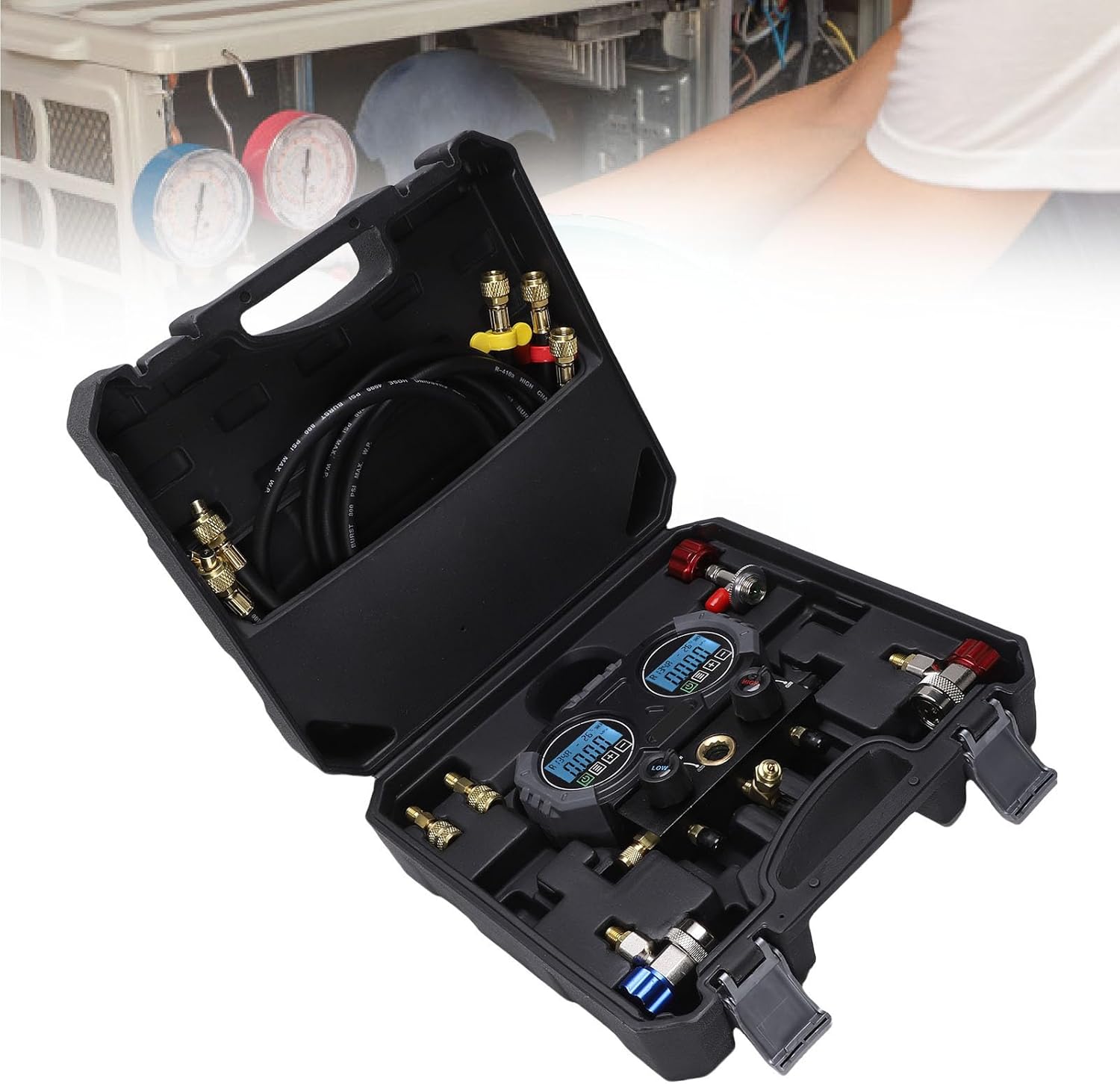 Specification: Item Type: AC Manifold Meter Product Material: ABS, Brass Battery: 1 x Battery (not included) Connection: 1/4 inch SAE Pressure Range: 0-60 BAR (0-6000 Kpa) Maximum Overload Pressure: 75 BAR Vacuum Range: -29INHG-0INHG Sensor Refresh Rate: 1 second Measurement Accuracy: ±0.2% Auto Shutdown Time: 30 minutes Backlight Screen Off Time: 1 minute Temperature Unit: ℃/℉ Applicable Refrigerants: R134A, R1234YF, R22, R290, R32, R404A, R407C, R410 A, R452 B, R454 B, R502, R507, R600, R600A, R12, R125, R401A, R401 B Applicable Units: MPA, KPA, BAR, PSI, INHG, KGF/CM² Resolution: 0.001MPA, 1KPA, 0.01BAR, 0.1PSI, 1INHG, 0.01KGF/CM² Packing List: 1 x Pressure Meter 3 x 1.5m R410A Brass Connector Hose 2 x Adaptor (R410A conversion) 2 x R134A Adjustable Connector 1 x R134A Anti Backflow Bottle Opener 1 x English User Manual 1 x Storage Box