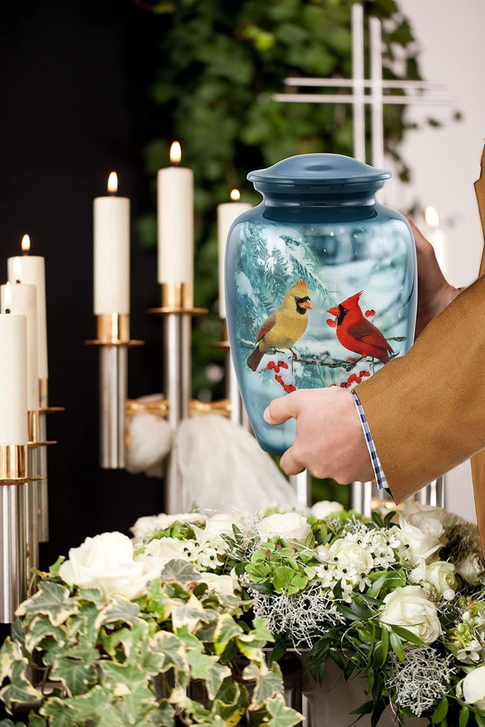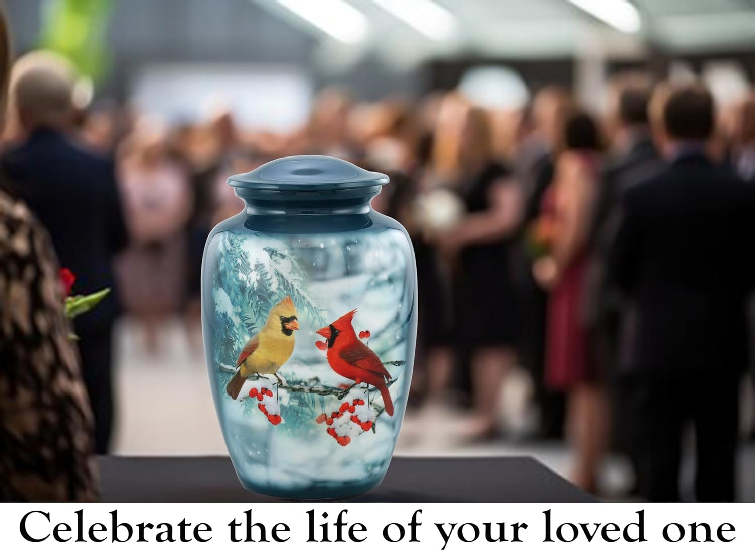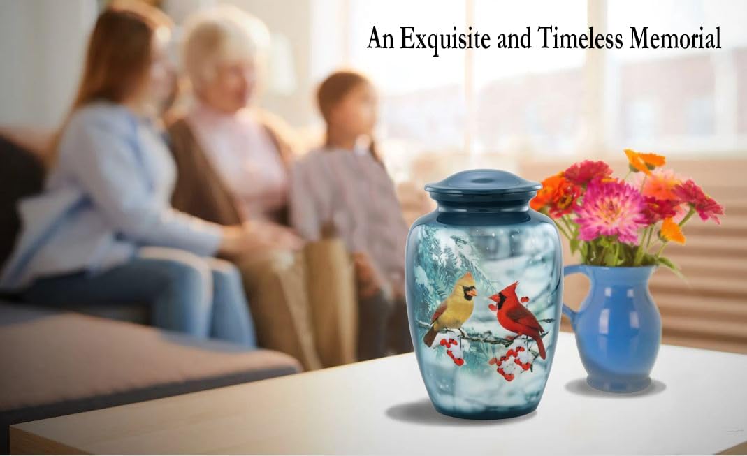 The Cardinal Couple Cremation Urn is a heartfelt tribute inspired by the belief that cardinals appear when angels are near. Featuring a beautifully detailed male and female cardinal perched together on a snow-covered branch, this urn symbolizes eternal love, companionship, and the comforting presence of those we’ve lost. Set against a peaceful winter background with soft snow, evergreen branches, and vibrant red berries, the artwork creates a warm reminder that love continues even through life’s coldest seasons. The two cardinals — one brilliant red and one softly golden — reflect the bond shared between partners, family members, or dearest friends whose connection lives on forever. Crafted from durable, high-quality metal and finished with vivid, fade-resistant artwork, this urn offers both beauty and lasting strength. The serene winter scene provides comfort and hope, reminding families that memories stay bright even when the world feels quiet and still. A secure threaded lid ensures that your loved one’s ashes remain protected, giving families lasting peace of mind. With a generous adult capacity and elegant display shape, this urn is perfect for home placement, memorial shelves, ceremonies, or as a cherished family keepsake. Whether honoring a spouse, parent, grandparent, or someone who loved cardinals or nature, this urn offers a gentle symbol of peace — a loving reminder that their spirit is still near, watching over you with warmth and grace. Let the Cardinal Couple Urn hold your loved one’s memory with beauty, tenderness, and everlasting love.