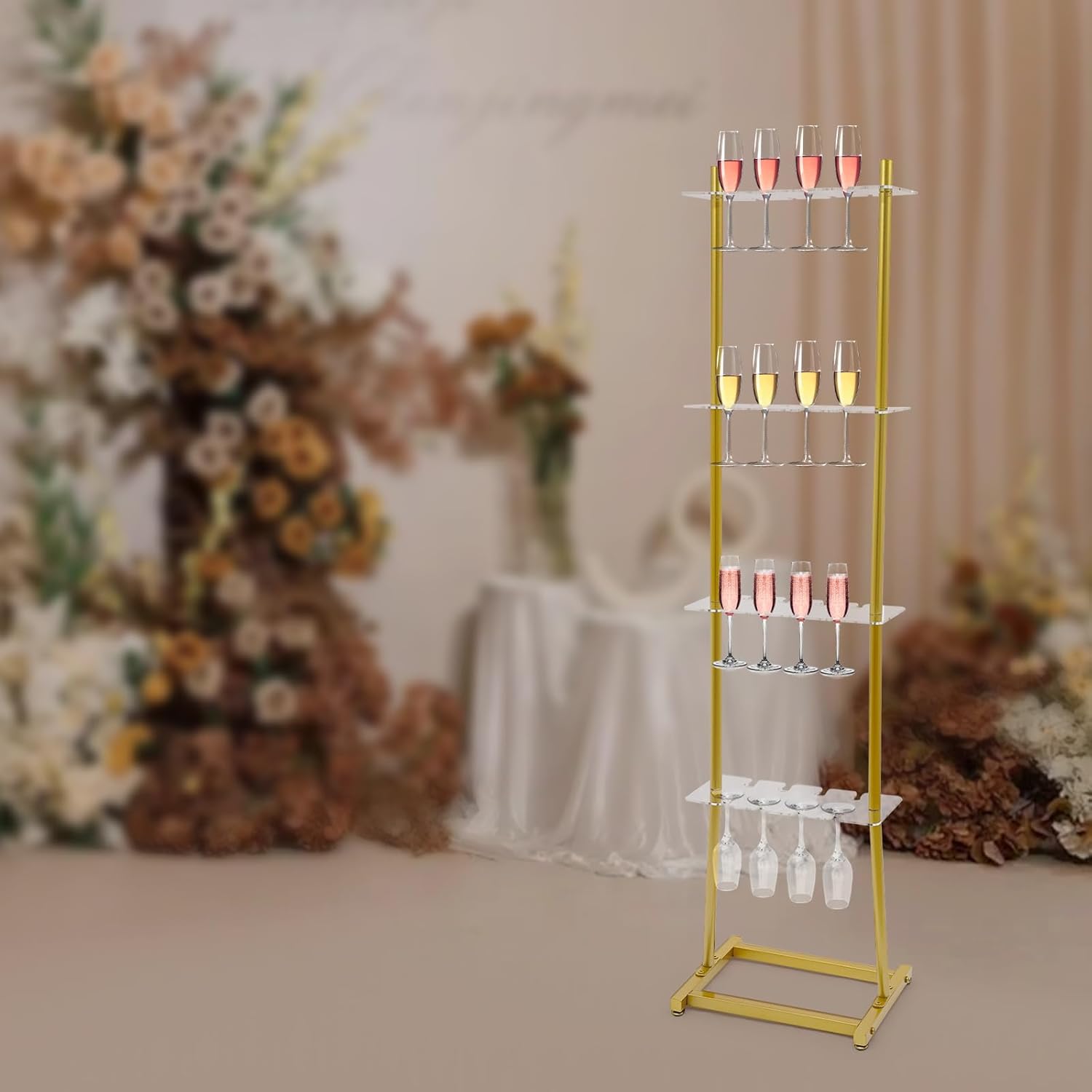 Our 4-tier champagne rack is both stylish and practical. It can elegantly display 32 champagne glasses, creating a romantic and elegant atmosphere. It is made of high-quality iron and acrylic, which is sturdy and ensures long-term use. The multi-layered design not only saves space but also serves as a focal decoration at parties, providing convenient dining services for guests. Come and buy it!