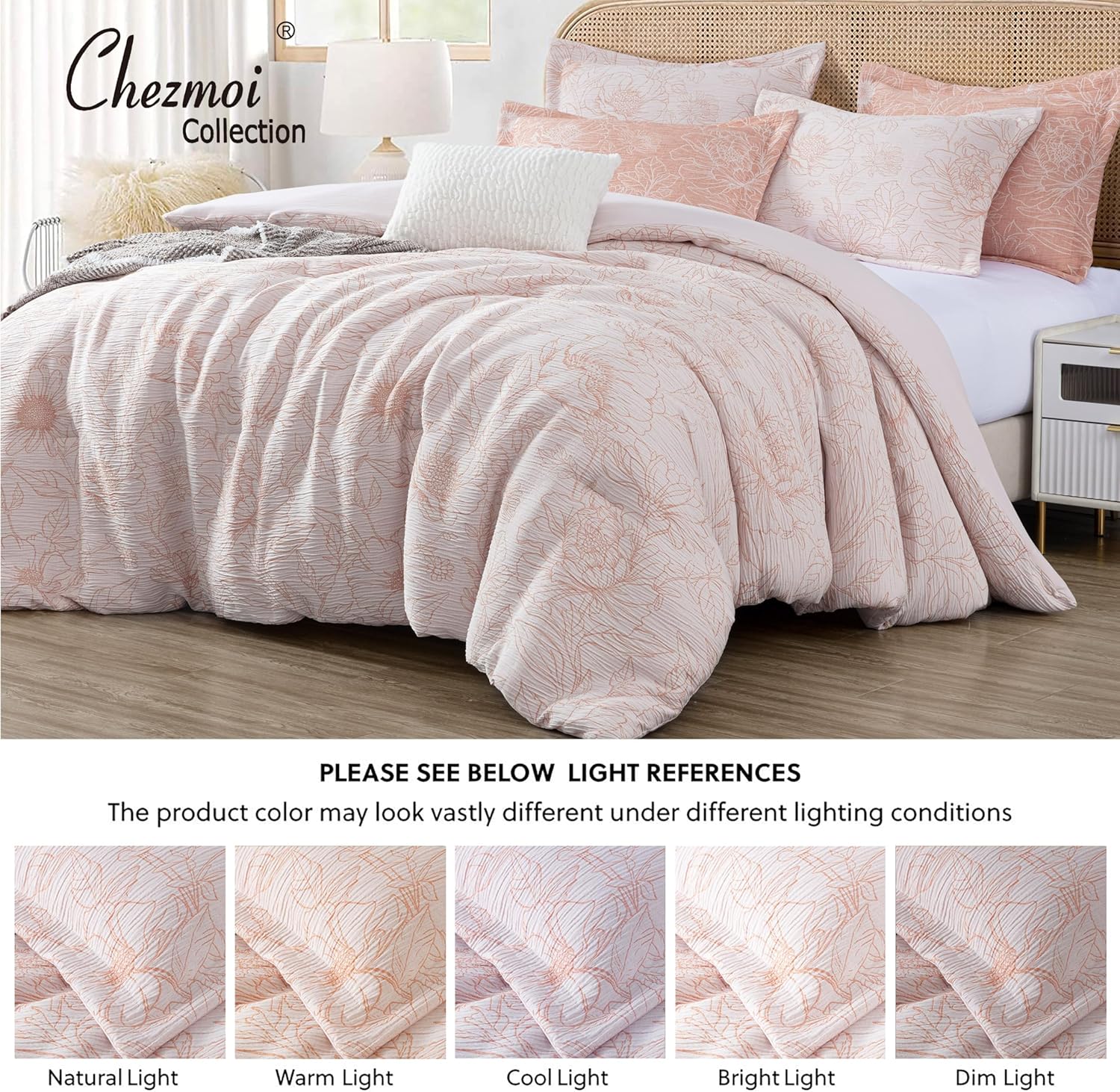 Introducing the Chezmoi Collection Katrina Floral Comforter Set, where elegance meets comfort in every weave. Transform your bedroom into a sanctuary of style and relaxation with this exquisite bedding ensemble. Crafted with meticulous attention to detail, the Katrina Floral Comforter Set boasts a stunning white and coral color palette, adorned with a delicate floral botanical pattern that adds a touch of sophistication to any décor. The soft jacquard textured fabric offers a luxurious feel, while remaining lightweight and breathable, ensuring comfort in all seasons. This set includes everything you need to complete your bedding ensemble: one comforter, four coordinating pillow shams (two pillow shams for twin size), and one charming faux fur fleece cushion for added flair. Whether you're curling up for a cozy night's sleep or lounging in bed on lazy mornings, the Chezmoi Collection Katrina Floral Comforter Set provides unparalleled comfort and style. Upgrade your bedroom décor effortlessly with the timeless elegance of the Chezmoi Collection Katrina Floral Comforter Set. Perfect for your own master suite or as a thoughtful gift for a loved one, this bedding ensemble is sure to become a cherished staple in any home.