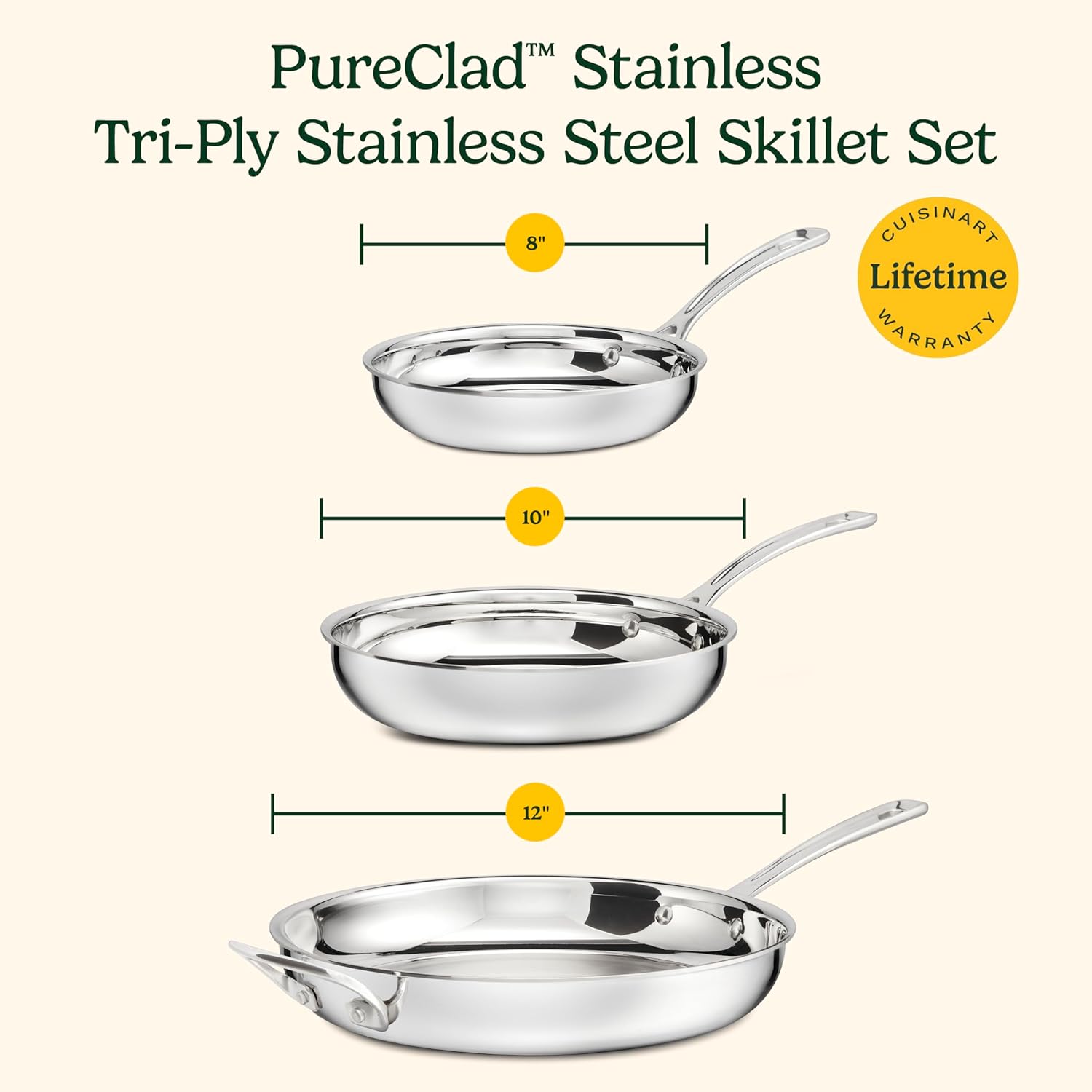 Crafted for both beauty and performance, Cuisinart’s PureClad™ Triple-Ply 15-Piece Stainless Steel cookware blends elegance with professional-grade quality. The luxurious, rounded full-body design enhances any kitchen, while the triple-ply stainless steel construction ensures durability and timeless appeal. Experience precise and even heat distribution with Heat Surround™ technology, where an aluminum core extends from the pan’s base up the sidewalls for flawless cooking results. Stay in control with cast stainless steel Cool Grip™ handles that remain cool to the touch, offering comfort and security. The tempered glass lids, framed with sleek stainless steel and wide handles, lock in moisture and flavor. The sealed, dripless rims ensure effortless, mess-free pouring and make cleanup a breeze in the dishwasher. Compatible with all stovetops, including induction, and oven-safe up to 500°F (450°F for lids), this cookware is as versatile as it is timeless—ready to elevate every meal you make. Set Includes: 8" skillet, 10" skillet, 12" skillet with helper handle