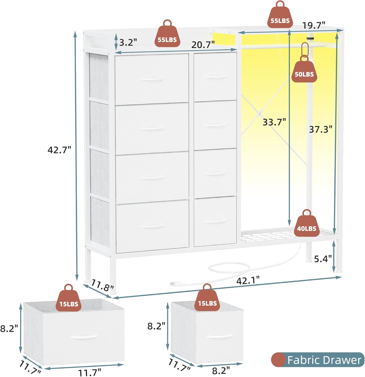 | Additional Features | 8 Fabric Drawers, Adjustable Feet, Hanging Rack, LED Light & Charge Station, Shoe Rack |
