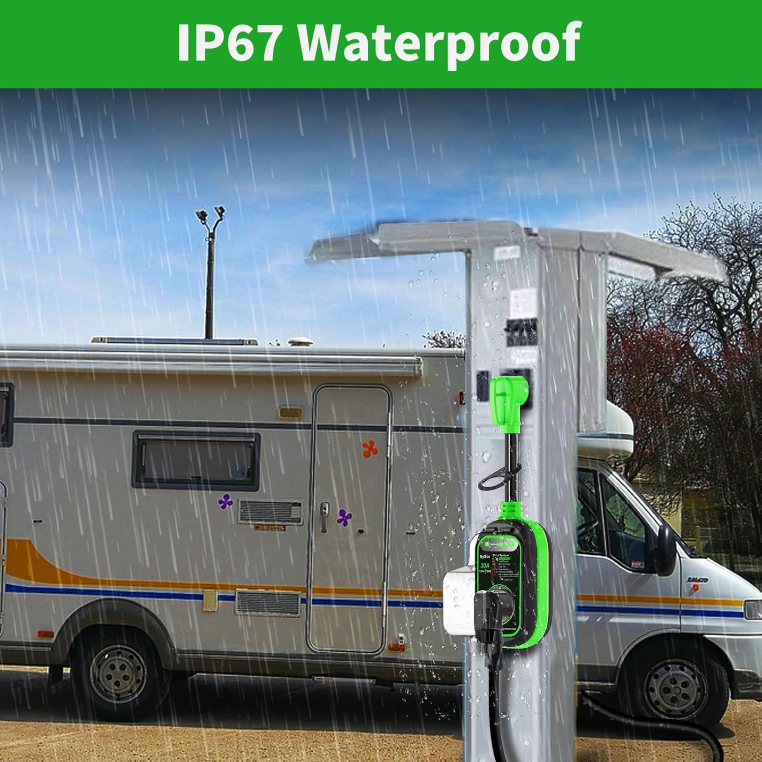EyGde RV Surge Protector 30 Amp Waterproof Upgraded 8400 Joules Surge Protector for 30Amp Plug, Voltage Protection with Circuit Analyzer Power Guard for Camper Travel Trailer, Green. 50 Amp to 15 Amp 110 RV Adapter - Patented 4200J Power Adapter with Surge Protector - Circuit Analyzer Power Guard 5-15P to NEMA 14-50R for Camper Travel Trailer