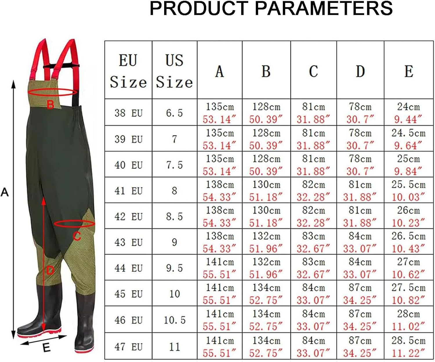 Unleash your outdoor adventures Chest waders are the ultimate outdoor footwear choice, trusted by hunters, trappers, fishermen and all kinds of outdoor enthusiasts Description: -Chest waders are lightweight and comfortable, waterproof and made for long-term use -Adjustable shoulder straps for greater flexibility and a more comfortable squatting position -Elastic waistband at waist for free adjustment Specifications: Product name: waders, waders, fishing pants, fishing clothes, hunting boots Material: pvc Applicable gender: men Size: 38, 39, 40, 41, 42, 43, 44, 45, 46, 47 Package contains: 1 x Chest waders Note: If you have a larger thigh circumference, please choose a size larger than usual. (Please refer to the size chart).