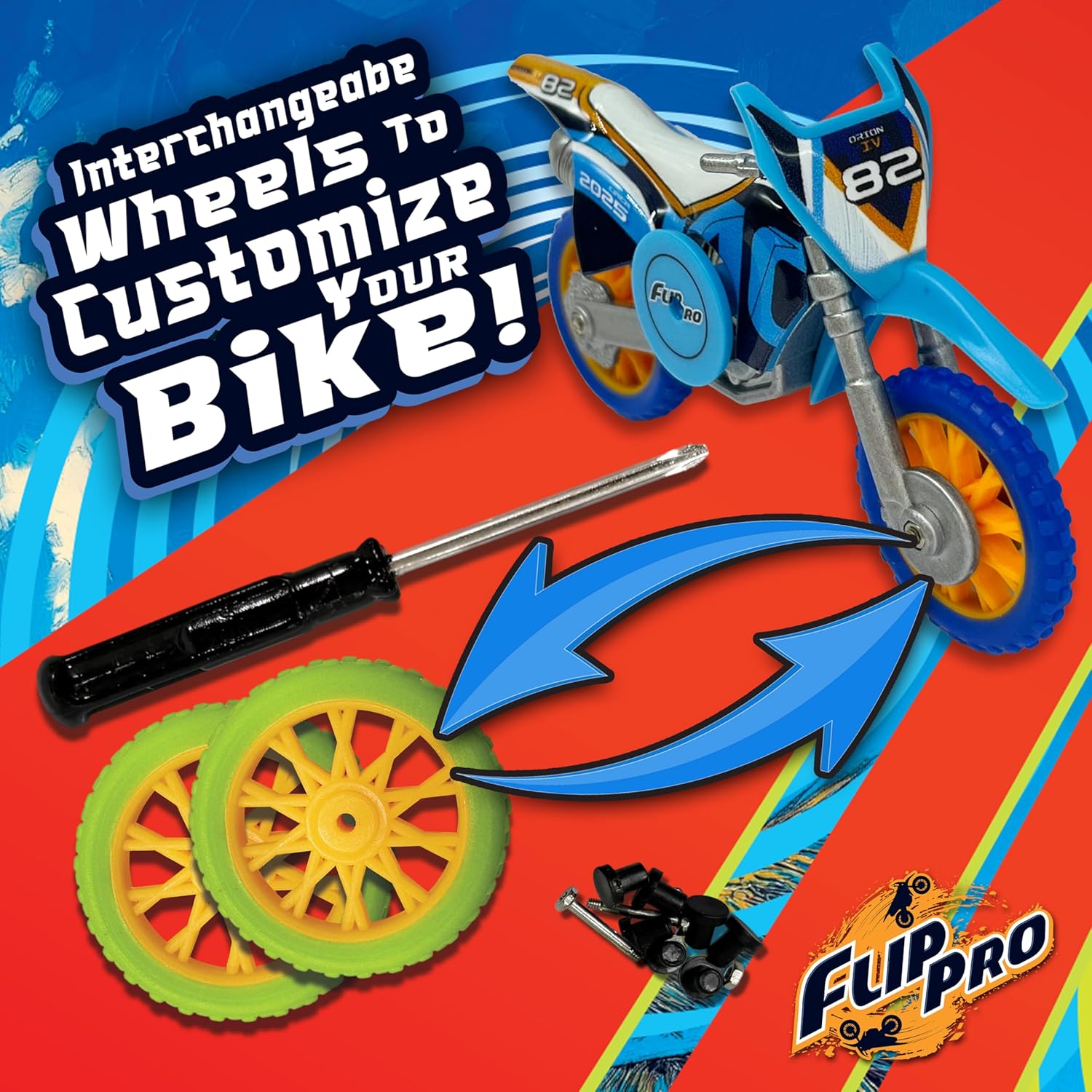 | Included Components | 2 ramps, 2 ramp ledges, 2 ramp clips, 2 custom wheel mixed colors, 1 bike, 4 cones, 8 barrels, 2 screws, 2 nuts, 1 screwdriver |