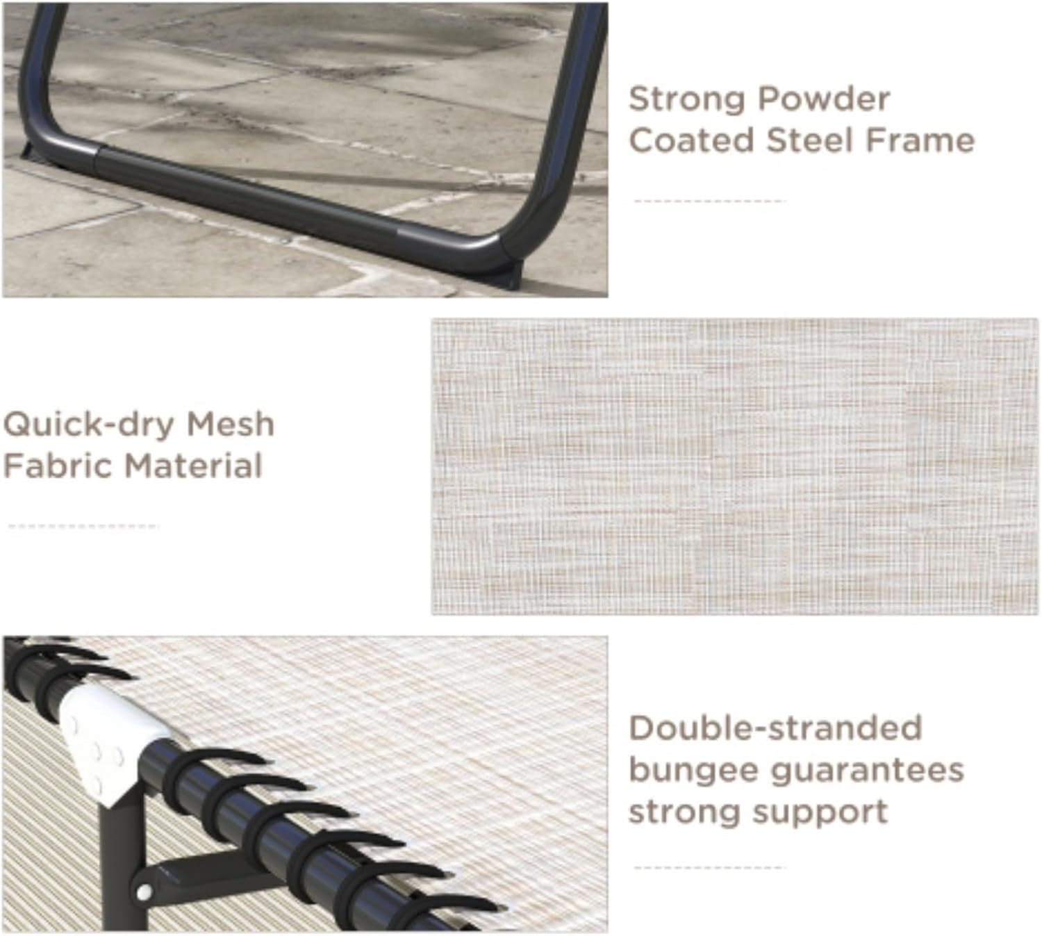 Our outdoor lounge chairs come with pillows to support your head, an adjustable backrest with four positions, and a footrest that moves up and down. Whether you like sunbathing, tanning, or taking a nap, you can find your favorite angle. Immerse yourself in a charming book, enjoy yourself, and lie in the warm sunshine. Unlike some rigid outdoor furniture, our body-hugging bungee sun loungers allow you and your friends to lie on a breathable surface. Product Information Product Type: General Merchandise Product Name: Folding Deck Chair Pool Chair, Terrace Sun Lounger, Outdoor Lounger Main Color: Creamy White Main Material: Steel Product Dimensions Assembled Length (inches): 77.50 Assembled Width (inches): 22.80 Assembled Height (inches): 11.80 Weight (pounds): 26.40