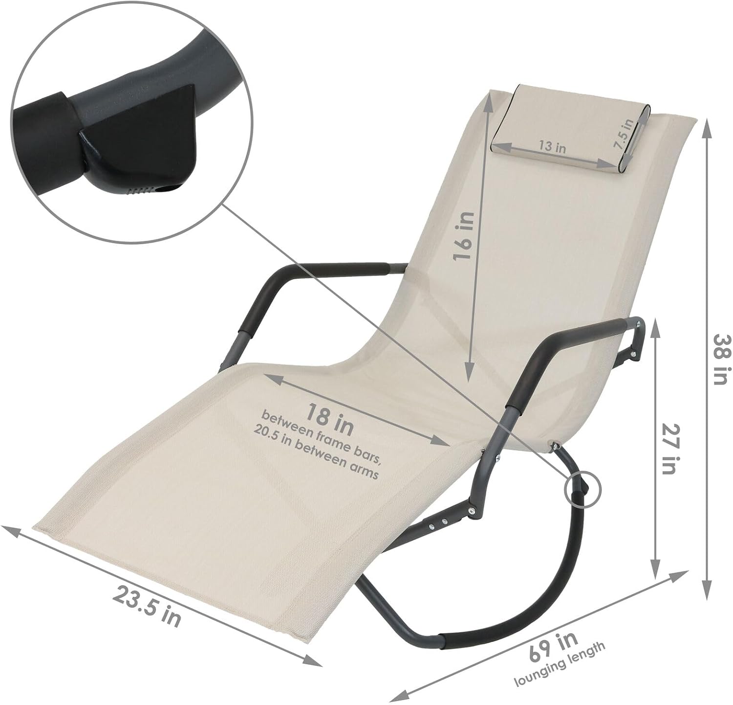 Add modern flair and ultimate comfort to any patio, cabin, or backyard with this folding, rocking, chaise lounge chair featuring convenient headrest pillows. This lounger features a durable steel tubular frame with powder-coated finish and weather-resistant 70% vinyon fiber and 30 % polyethylene cover with a polypropylene fiber filling. With the outdoors in mind, these chairs are able to withstand most harsh weather conditions, designed to last for years to come. And, the included pillow is sure to provide extra comfort so you can relax your head and soak up the sun. These chairs are made to last, easy to maintain, and even easier to use. Plus, the material dries fast which makes the cleaning process even easier. To clean, simply use a damp cloth and spot clean. With their elegant, modern design, relax the day away with a good book, a nap, some snacks, or a loved one on the patio, deck, yard, front porch, poolside, or other outdoor living space!