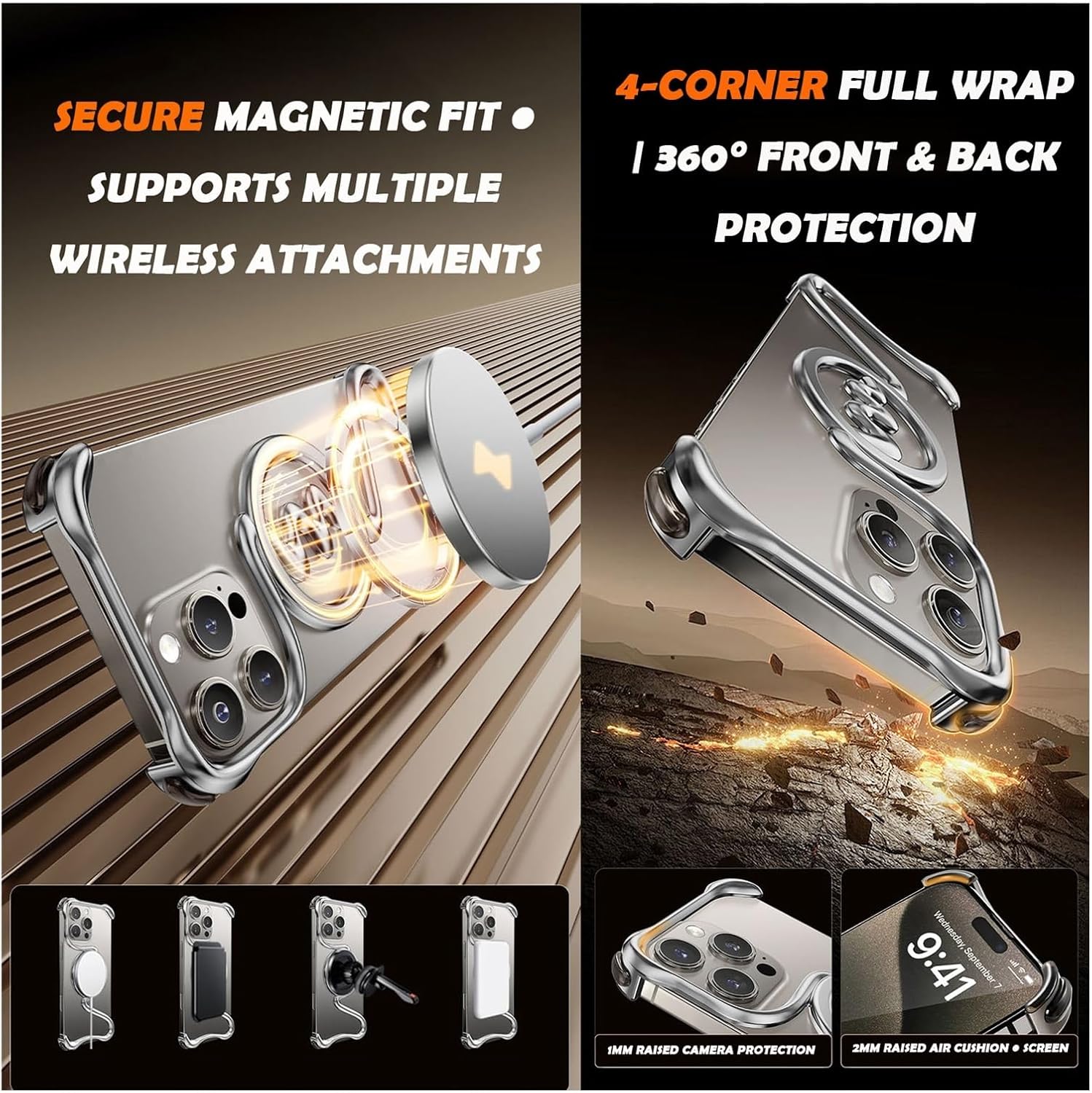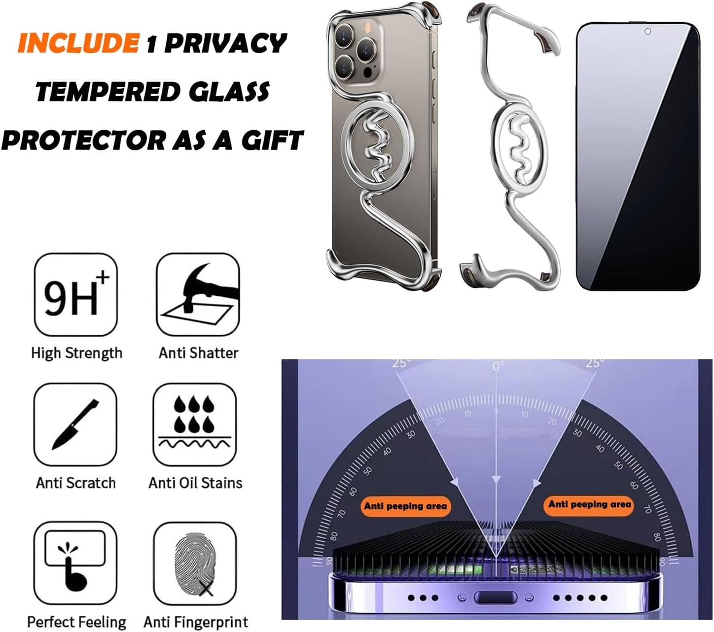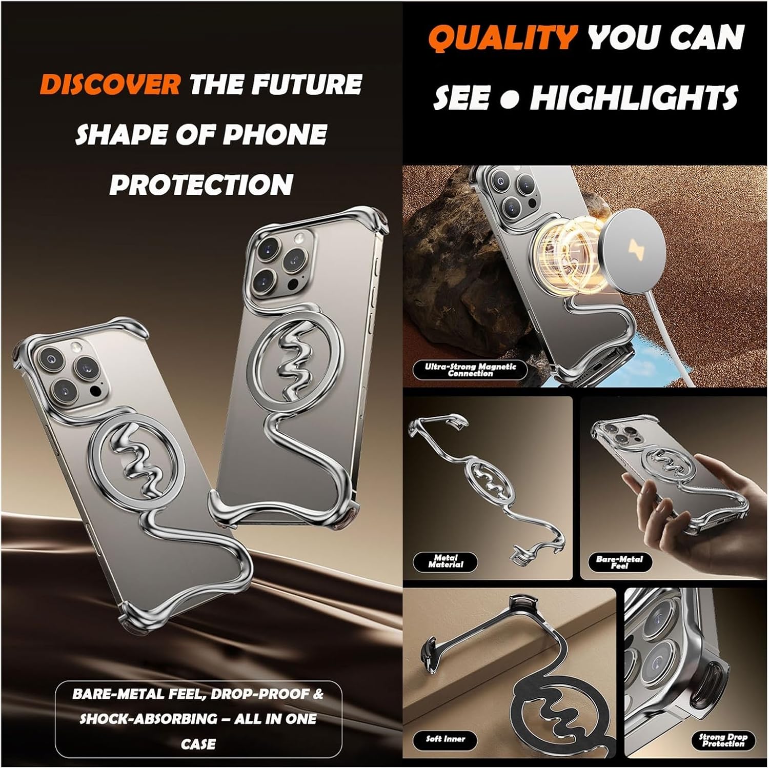 Why Choose This CaseYour Phone 16 deserves a case that is as sleek, durable, and innovative as the phone itself. This Frameless Metal Case is designed for those who value minimalist aesthetics, reliable protection, and seamless compatible with MagSafe—all in one lightweight design.Key FeaturesFrameless 3D Hollow DesignCrafted from aircraft-grade aluminum alloy, the borderless bumper with hollow curved lines maximizes heat dissipation and restores the bare-hand grip of your Phone. Perfect for minimalists who dislike bulky covers.Ultra-Thin & Feather-LightAt only 33g (as light as 3 coins), this case offers all-day comfort without weighing you down. Slip it into your pocket or hold it for hours—your phone stays protected yet feels almost case-free.Magnetic Accessories ReadyWith 38 integrated N52 magnets, the case locks firmly onto chargers, wallets, power banks, and car mounts. No slipping, no misalignment—just stable charging and secure magnetic attachment every time.Shockproof Protection Where It MattersDesigned with military-grade air cushion corners and raised bezels—2mm above the screen and 1mm above the camera—to shield your phone from scratches, bumps, and accidental drops. Reliable defense without added bulk.Premium Comfort Inside & OutThe flocking inner lining prevents scratches on the back of your Phone, while the matte metallic edges deliver a skin-friendly, non-slip grip. Every detail is built for comfort, durability, and elegance.What’s in the Box1 × Frameless Metal Case for iPhone 16 / 16 Pro / 16 Pro Max1 × Free Privacy Tempered Glass Screen Protector (extra safeguard for your screen)Perfect For✔️ Business professionals who want a premium leather-metal look✔️ Tech enthusiasts who demand heat dissipation✔️ Minimalists who love a slim, frameless, natural grip✔️ Everyday users who need drop protection without bulkOur GuaranteeWe stand behind the quality of every case we make. If you encounter any issue, simply reach out to us. Your satisfaction is 100% guaranteed—shop with confidence.