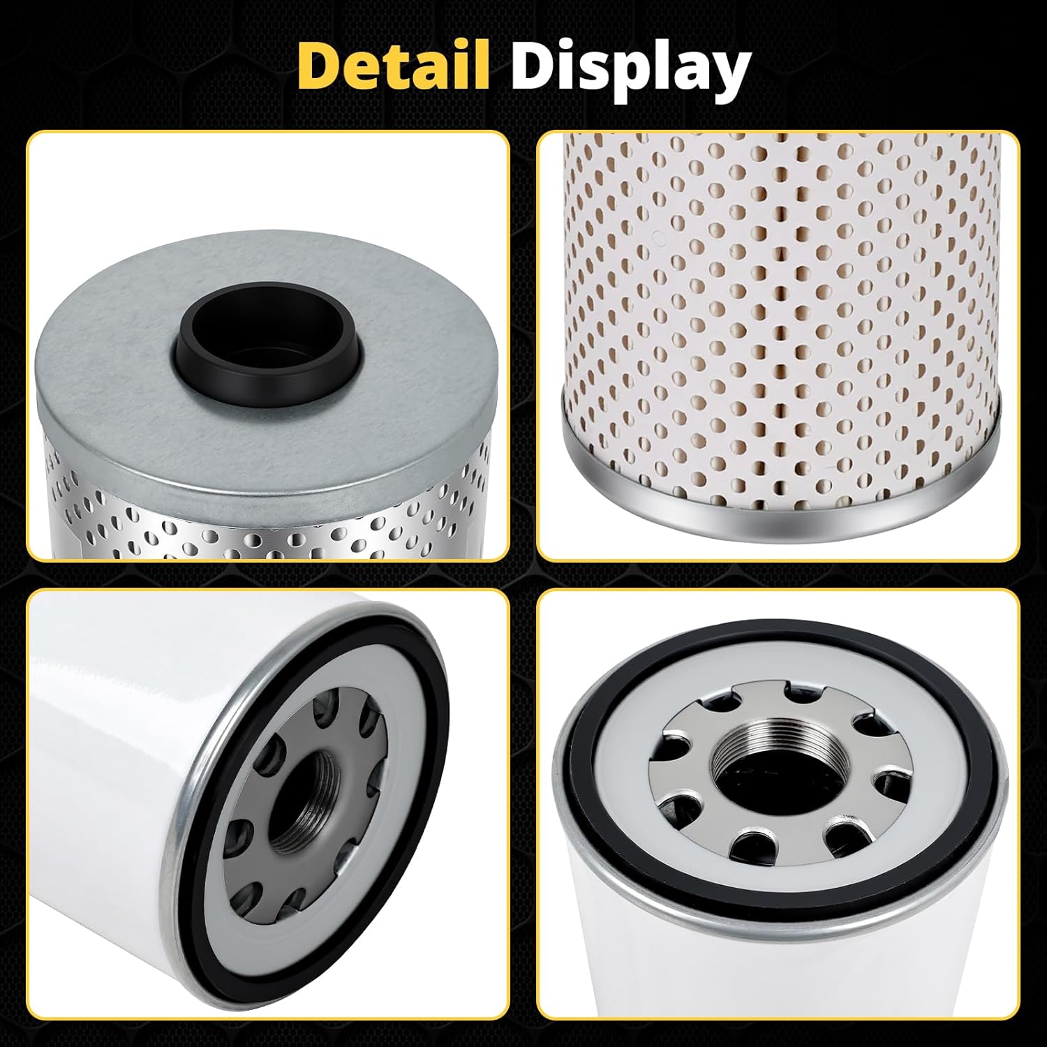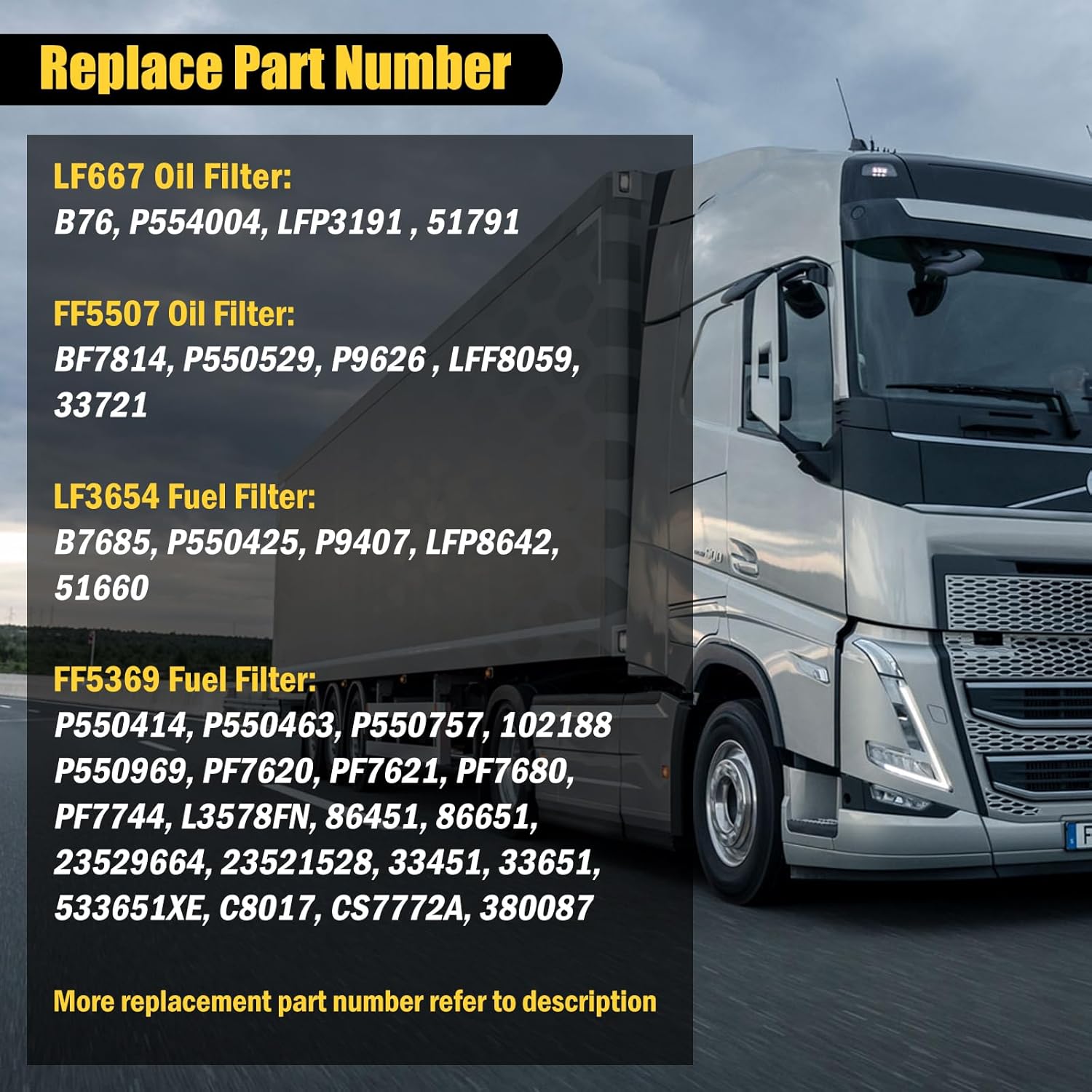 Replacement Part Number: LF667 oil filter: 1R0058, 1R0658, 1R0739, 1W3300, 24185, 24656, 24978, 24980, 25011932, 2836, 2P4004, 2Y8096, 303498433, 3134053, 3222310755, 3Y0900, 3Y0900X, 3Y900, 3Y900X, 332095608, 3600140, 41035000133555, 485GB3191, 485GB3191A, 485GB3191B, 485GB4348, 5000133555, 51791, 51791MP, 538322, 551791, 6005019774, 60507493, 6439392, 6439393, 6884417, 69704773, 80749, 81621979, 85791, 85791MP, 873, 92791, 92818017, 9309, 9361, 9414100547, 9455081026, 9805115800, AP77401A, AZL083, B76, B7600, B7600SS, B76B, B76SS, B9604, BK6029, BK6082, BK6094, BK6185, BK6287, BK6656, BK6663, BK6956, BPH49A, C55011, D1700202, DK101, ELF7739, F27, F40, FL307, FL307FP, FOE190, FP531, G051791, GL312, GP51, GP51M, HF912, KW667, L177, L177U, L301, L50068, L59068, LF327, LF327XS, LF531, LFP3191, LFP3191TRT, LFP554004, LK77401, LS778, OC121, P172559, P531, P553191, P554004, P559576, P779143, P903271, PER67, PER68, PF1223, PF857, PH49, PH49A, PH49AFP, PH3191, PH5394, PL667, PM481, PS400, PSL400, PSL417, QS49A, R90, S279CP, V478736, W1110218, W1173, W1250599, WGL667, Y03601712, Y05008003, HDO1, 2314400, 330560321, MH3301LF3654 oil filter: 000E716035001, 11214514, 119962280, 1533832180034, 20843764, 20844376, 20845764, 21707132, 21707135, 2344600, 2914960300, 2KXW6, 3076P9407, 330050134, 3562227702, 41190025, 42027494, 451300003, 471392, 4713921, 477556, 4775565, 5000812484, 5001846647, 5021149092, 5839LF3654, 60514138, 6051438, 7420430751, 7420541379, 85114535, 85401917, 85660, 89002457, 90015, 9021110200, 9231100057, 92660, 98041803, 986B010020, ABPN1OGLF3654, BALB7409, BALB7685, BALBK6650, BALBK6656, BALBK6956, BBU9687, BI10260, BL2100, C57022, C5717, C7517, CS14993, DONP550425, E716035001, FCL7276, FCL74422, FCL7504, FGLF3654, FGZLF3654, FH3654, FHU634, FJLF3654, FJX202, FT5596, |FTGLF3654, GM25506, GP556, H200WN, H200WNO1, L1LFP8642, L2LFP8642, L375, LF3654FLG, LF675, LFP8643, LFR83654, LS842I, LSB5145, MAN6504, OC282, OP631, P5465, P5786P8642, P9407, PF1267, PFL5623, PSL419, R214, RJ625X, RL357, S4120R, SFO5565SO11029, SP4530, SP589, VO2090, VOE477556, WGL3654WO750, WP11102, WP111023, WP1295, WT529002, ZLF3654FF5507 fuel filter: 09864B2016, 1457434446, 1517416, 20405160, 204307511, 20539582, 20815011, 20972293, 20972295, 20972295HOU, 20976003, 20976005, 2334200, 2434200, 2914984900, 330052737, 37215001868493, 51125030053, 56045594, 57GC2186A, 7420541381, 7420875666, 7420972291, 7420976001, 74851166344, 85114535, 86721, 9239763470, 95037E, ATLP9626, BALBF7814, BALBK6650, BALBK6656, BALBK6956, CS1443M, DN1956, DONP550529, F026402017, FC7104, FCX402, FF1176, FF5507FLG, FFR85507, FSM4261, FSM4261ZZZ, H200WDK, J018288, KC251, KC300, P550739, P9626, PP9641, PSC80, RC358, RC551X, RN239, RS250RCRO2, S9320NR, SF8428, SFF3751, SK3320, SN70201, SP1270, SP9288M, TP3010, VF1987, WDK11102, WDK111021, WDK111029, Z398FF5369 fuel filter: 1696265C1, 23514049, 23521528, 23529664, 25003565C1, 2KXY5, 301SD19, 301SD19A, 301SD1903102L3578FN, 33451, 380087, 42034065, 4803007D, 531437, 533651XE, 5541449300, 5839FF5369W, 69032924, 6941666, 8510557485114042, 86651, 9051272, ABPN10GFF5369W, BALPF7680, BALPF7744, C8017, CS7772A, DONP550757, F65273, FF1065, FF1066, FF1175, FF5369WFLG, FFR85369, FFR85369W, FLEFF5369W, FTGFF5369W, G128, L3578F, LUBIL3578FN, P550414, P550969, PF7548, PF7620WGF5369Compatible Models: V olvo D12 and D13 engines.Package Includes: 2 x LF667 Oil Filter1 x LF3654 Oil Filter1 x F5507 Fuel Filter1 x FF5369 Fuel FilterSize of LF667, LF3654, FF5507 Filter:Largest OD: 4.239"Overall Height: 10.39"Size of FF5369 Fuel Filter:Largest OD: 3.82"Overall Height: 7.03"Benefits of the advanced oil change kitKeeping the fuel in your car in good condition can help avoid damage to your engine and other fuel delivery components. This diesel fuel filter captures 98 percent of water contaminants, ensuring your engine receives steady supplies of pure, dry diesel for optimal performance.
