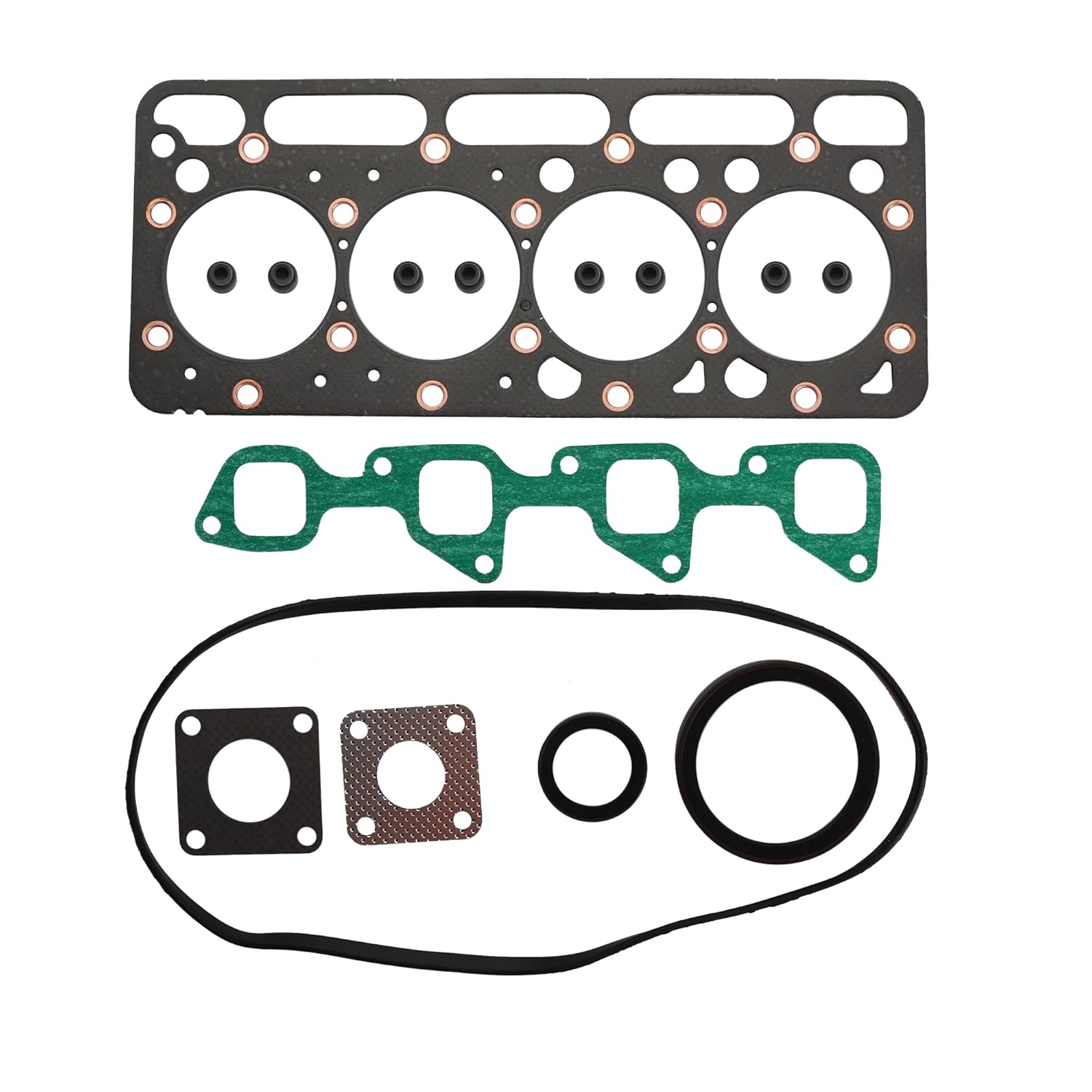 Fiiment: Fit for Kubota Engine V2203 V2203E V2203B V2203T V2203-M V2203-M-DI V2203MDI-Tier II V2203-M-DI-E2B-BC-1 V2203-M-DI-E2B-BC-3 V2203-M-DI-E2B-BC-3-Tier II V2203-M-DI-E2B-BC-5-Tier II Fit for Engine V2403 V2403E V2403M V2403TMDI V2403-M-DI V2403-M-DI-TE2 V2403-M-DI-TE2B V2403-M-DI-TE2B-BC-1 Fit for Excavator KX121-2 KX121-3ST KX121-3STCA KX161-2 KX161-3S KX161-3SCA KX161-3ST KX161-3STCA U-45 U45-3ST Fit for Tractor L4200DT L4200DT-C L4200DT-GST L4200DT-GST-C L4200F L4200F-C L4200F-GST L4240DT L4240DT-3 L4240GST L4240GST-3 L4240HST L4240HST-3 L4240HSTC L4240HSTC-3 L4300DT L4300F L4310DT L4310DT-C L4310DT-GST-C L4310DT-HST-C L4310F L4310F-HST-C L4310GST L4310HST L4310HST-C L4400DT L4400F L4400H L45 L4600DT L4600F L4600H L4610DT-GST L4610DT-HST L4610DT-HST-C Fit for Tractor L4740GHST L4740GST L4740GST-3 L4740HST-3 L4740HSTC L4740HSTC-3 L48 L5030GST L5030HST L5040GST L5040GST-3 L5240HST L5240HST-3 L5240HSTC L5240HSTC-3 L5740HST L5740HST-3 L5740HSTC L5740HSTC-3 M4800SUD-F M4800SU-F M5140DT M5140DTC M5140F M5140FC M5140HD M5140HDC M5640SU M5640SUD M5640SUD-1 M59 MX4700DT MX4700F MX4700H MX5000 MX5000DT MX5000F MX5100DT MX5100F MX5100H Fit for Wheel Loader R520S Fit for Bobcat Excavator 331 334 335 337 341 430 435 E42 E45 E50 Fit for Toolcat Utility Vehicle 5600 5610 Fit for Skid Steer Loader S130 S150 S160 S175 S185 S205 T110 T140 T180 T190 753 753C 753F 753G 753H 753L 763 763C 763F 763G 773 773C 773F 773G 7753 Fit for CASE Skid Steer 1838 Fit for Scat Trak Skid Steer 1300 Part Number: Upper Gasket Kit: 1G465-99350 07916-29505 1G925-99352 1G486-99360 6689014 6657401 6689012 1G46599350 0791629505 1G92599352 1G48699360 Lower Gasket Kit: 1G486-99360 07916-29515 6689018 1G48699360 0791629515 Head Gasket: 1E013-03312 19077-03310 1G790-03312 6685078 1E01303312 1907703310 1G79003312 Water Pump Gasket: 15766-73430 1576673430 EX-Manifold Gasket: 15522-12350 1552212350
