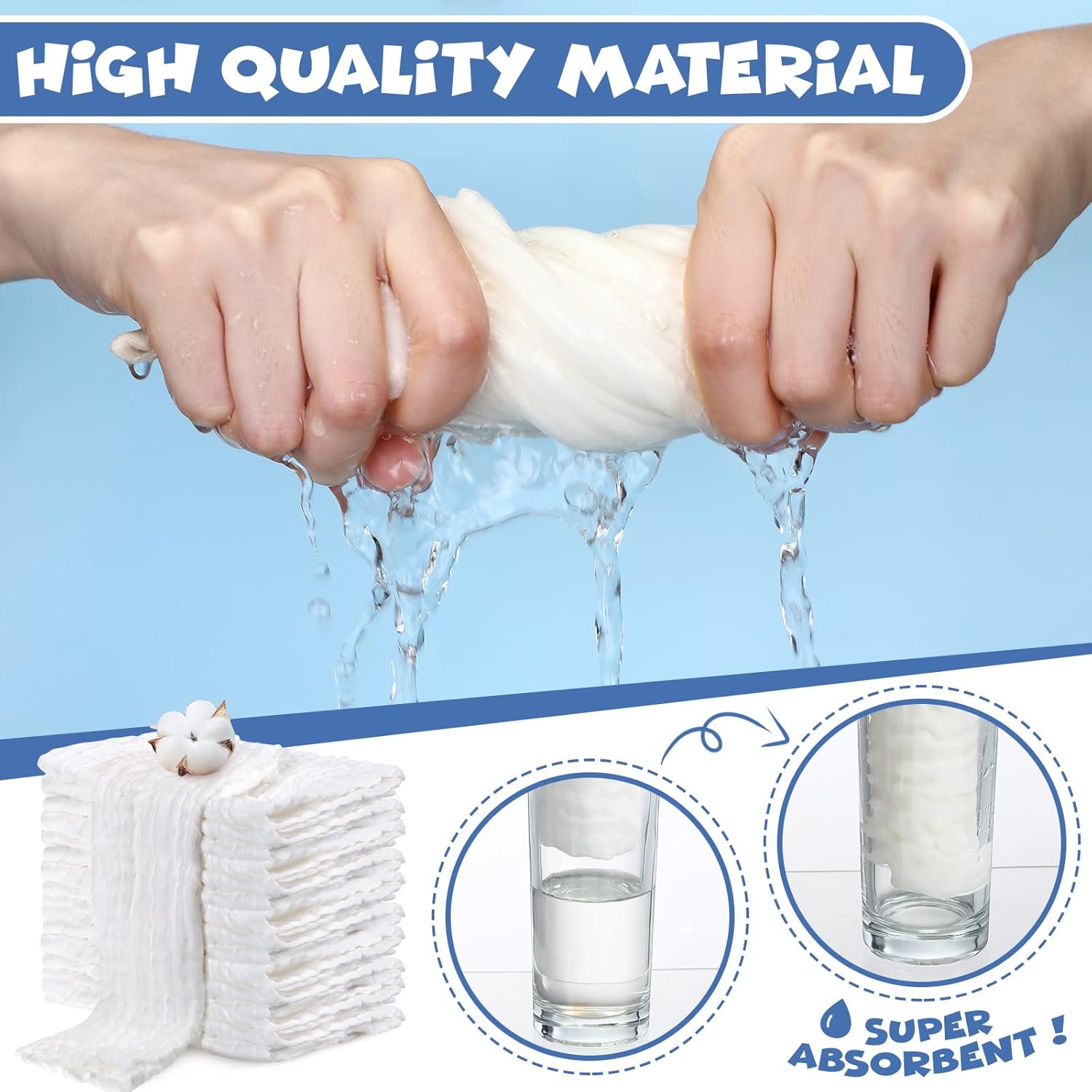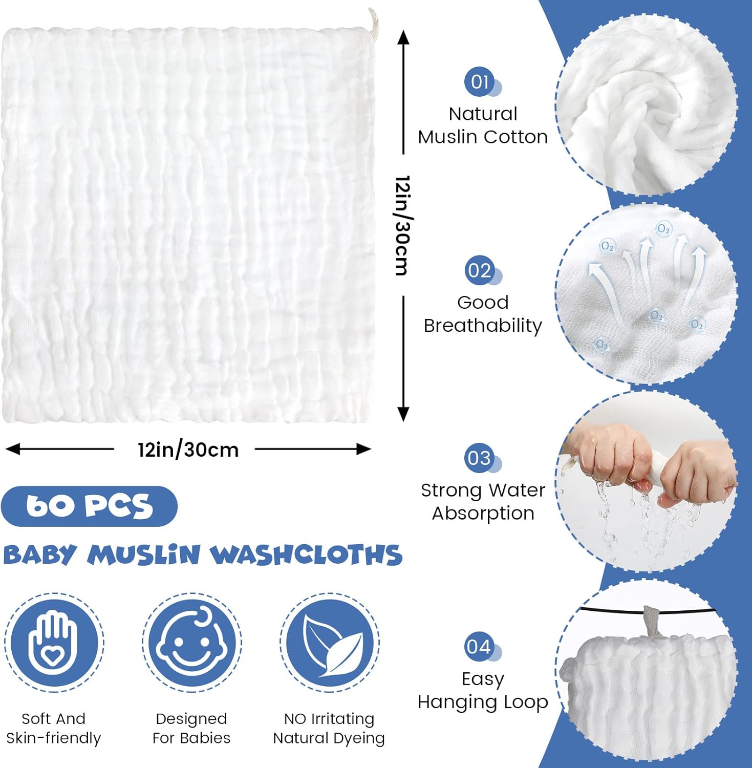 Features: 6 Absorbent layer design: These baby burp rags feature 6 layers, thick enough to absorb liquids, easily wipe off sweat and water, and provide you with a comfy using experience. Why choose our baby washcloths: Baby towels are not only an appropriate size, but are more friendly to the baby's skin. You could also use it as an adult or as a face towel for sensitive skin (to dry your face after washing). Specifications: Material: muslin cotton Color: white Size: 12 x 12 inch Package includes: 60 x Muslin burp cloths Notes: Manual measurement, please allow slight errors on size. The color may exist a slight difference due to different screen displays. Do not wash baby towels together with zippers, buttons or clothing with strong metal, as it may be scratched.