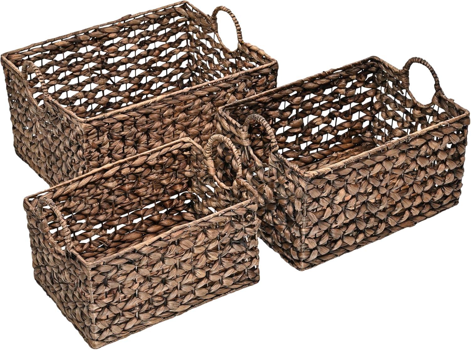 Organize your living room, bedroom, bathroom or nursery with Bohemian style with our set of three woven storage baskets. They're hand-woven from natural hyacinth fibers with circular handles for a cottage look. These versatile baskets can hold toys and books, and organize the changing table, crafts or pantry supplies.