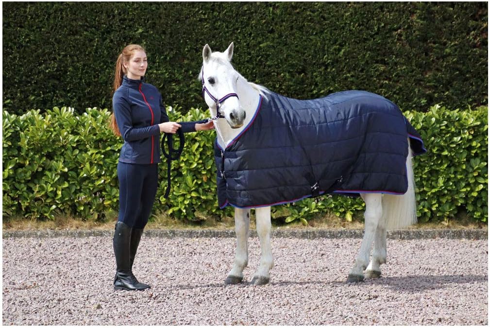 Keep your four-legged friend toasty with this 250g fill stable rug – perfect for cold winter nights. Featuring a fleece lined wither area to prevent rubbing front twin surcingle chest closure to ensure a secure fit and blue and red detailing to finish the look. Features: 250g fill Fleece lined wither area Twin surcingle chest closure Fillet string Blue and red binding Matches the Hy Signature collection