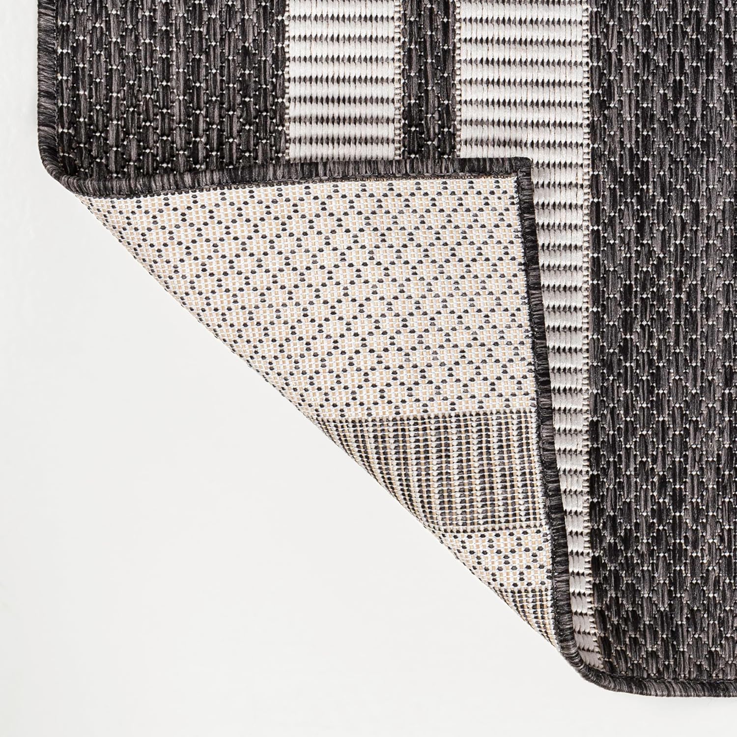 This rug's modern geometric pattern is inspired by Art Deco. It's made from durable synthetic fibers woven into a bold design. Use this stylish rug outdoors, or in the bedroom, living room or dining room.