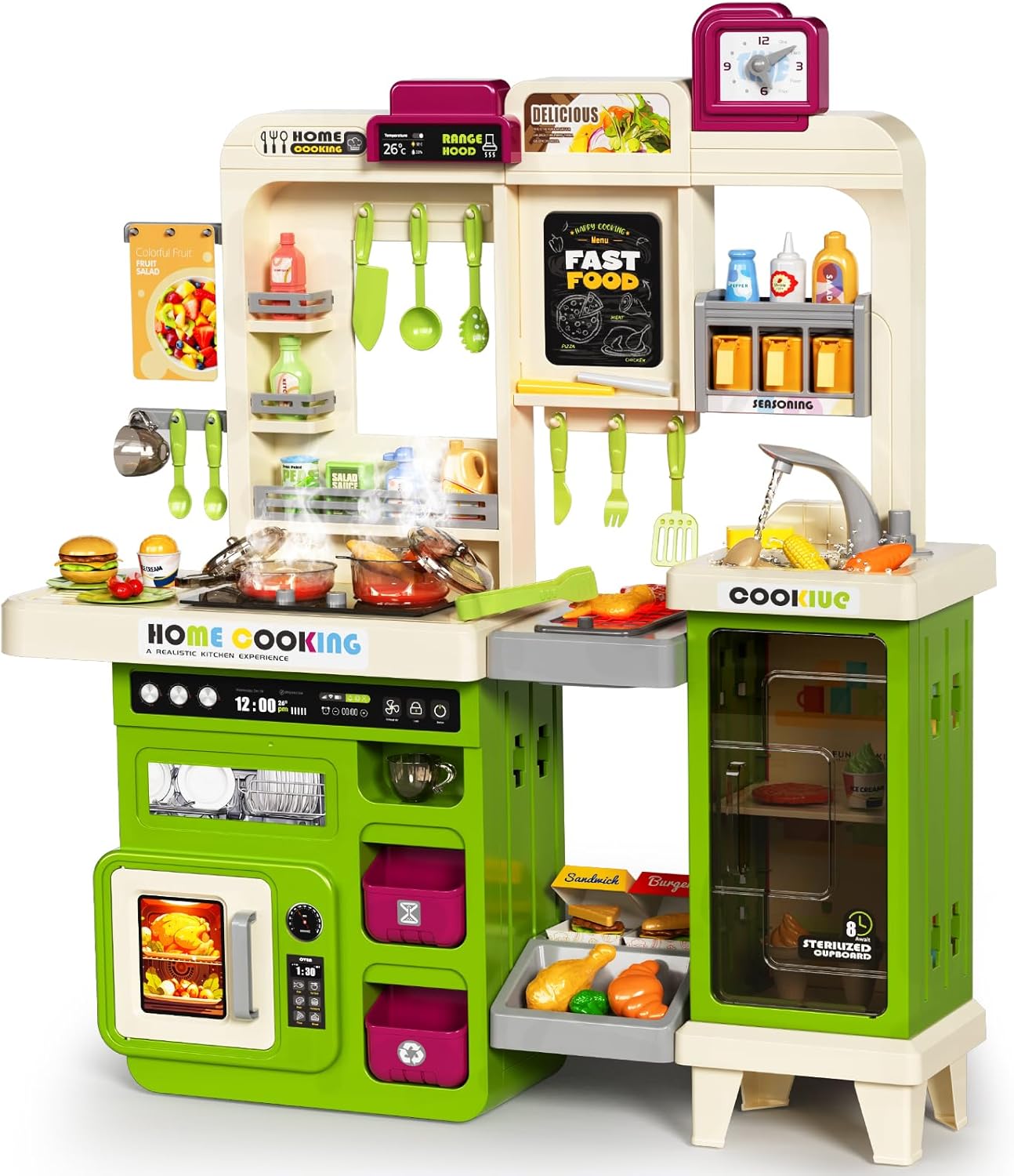 | Included Components | 3 in1 play kitchen, 80+ kitchen accessories for hours of fun, play sink with running water, play stove with steam, lights and sound, toy grill |