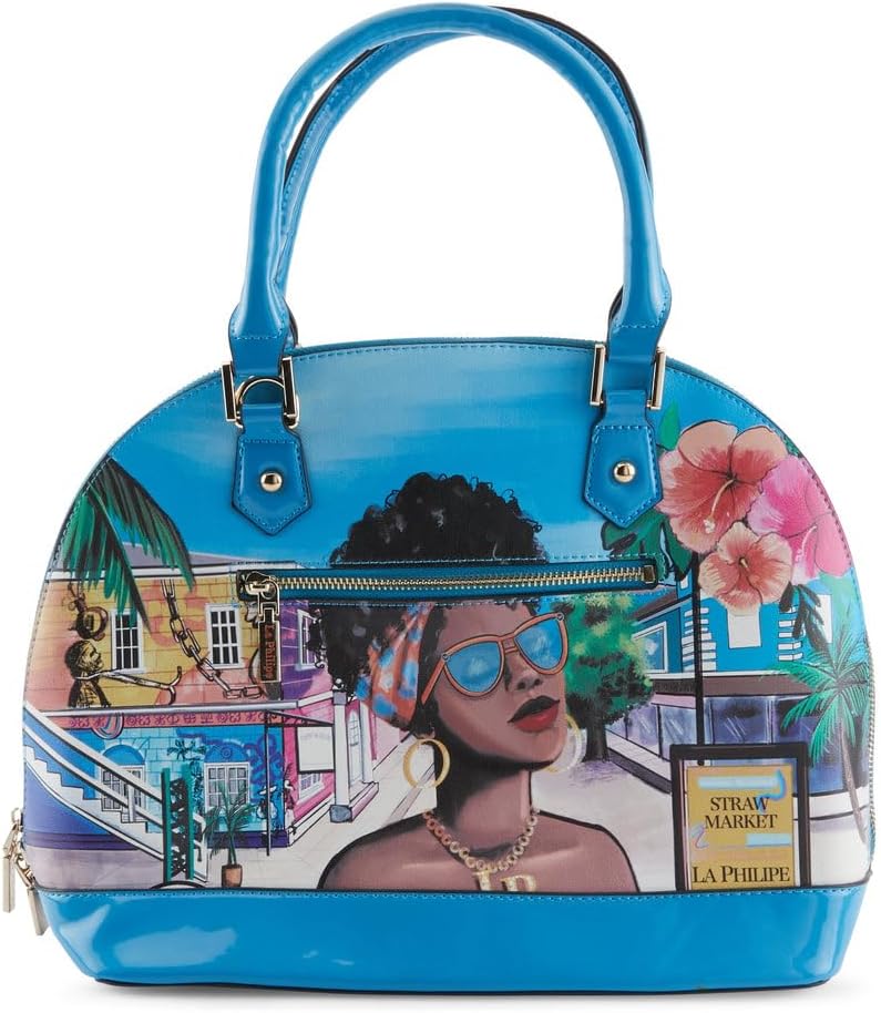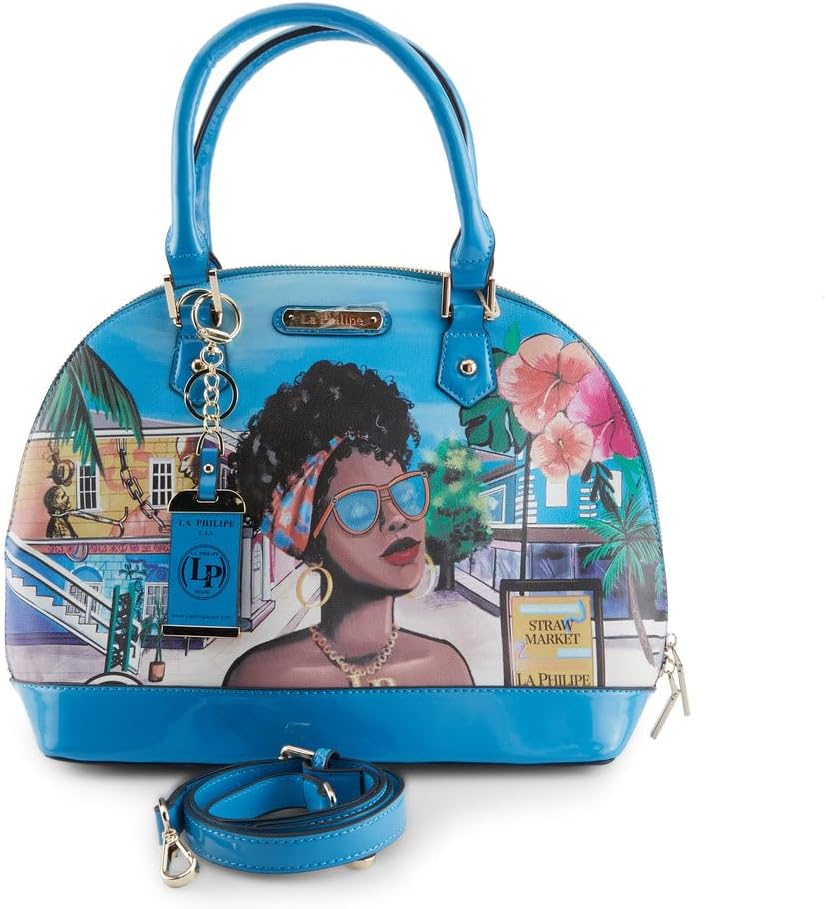 Channel the vibrant energy of the islands with the La Philipe LP1023-8 Blue In Bahamas Oval Handbag. Crafted from 100% premium PU leather, this bold accessory showcases a striking cityscape design with a fashionable lady set against a vivid blue backdrop. Its oval silhouette offers a chic, modern twist that makes it stand out from ordinary handbags while complementing your wardrobe effortlessly.This handbag blends statement-making artistry with everyday practicality. Its structured oval form provides durability and style, while the secure closure and spacious interior make it ideal for carrying daily essentials like your phone, wallet, and small accessories. Lightweight yet resilient, it’s designed for both casual outings and more sophisticated occasions.Whether you’re heading to brunch, shopping in the city, or traveling to your favorite getaway, the Blue In Bahamas Oval Handbag captures your adventurous spirit while delivering on comfort, utility, and style. It’s more than a handbag—it’s wearable art that reflects your bold personality.- Pockets: Exterior - 1 Rear Zip,2 Interior -2 Slip, 1 zip - Measurement (LxWxH), inch: 14x6x11 - Handbag Drop Measure: 5 1/2" - Shoulder Strap Measure: 20-23"