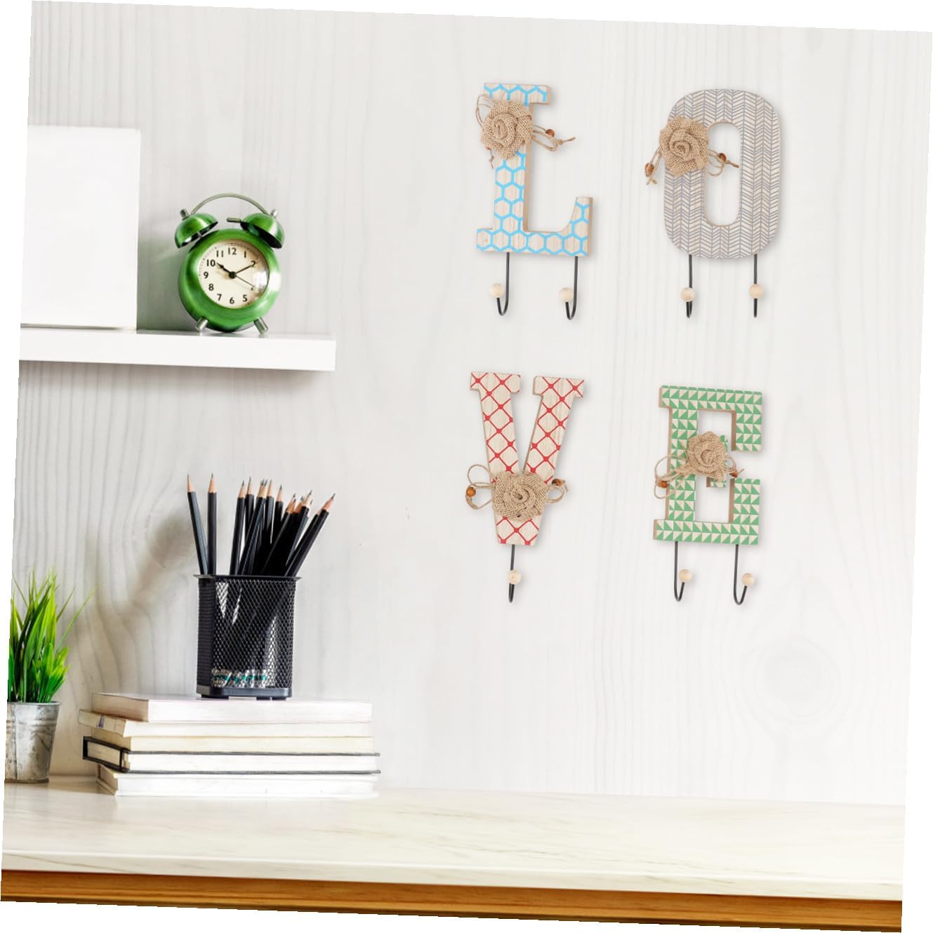 Package Include 4 x Hooks Characteristics -Product Info:Letter hook -Size: 25.00X12.00X5.00cm/9.82X4.72X1.97in -Material: Metal, Artificial board -It can be used to several items at the same time, very practical small metal hooks. -Load-bearing, and use, multi-function, very convenient to use coat hooks. -Elegant and stylish style hanging clothes hook, simple and beautiful vintage wall hook. -Smooth and mellow surface, this row hook will not scratch or damage your hand or clothes wall decoration. -It can be regarded as an gift for your families and friends, suitable for many occasions use wardrobe hangers.Goods Descriptionroom decor Smooth edges row hook will not scratch or damage your body or clothes.ornaments hooks Stylish and simple style, beautiful and elegant look, will add warm atmosphere for your home.hooks for hanging coats Do you want to have a fashionable and simple row hook for your clothing storage? It will be very practical and