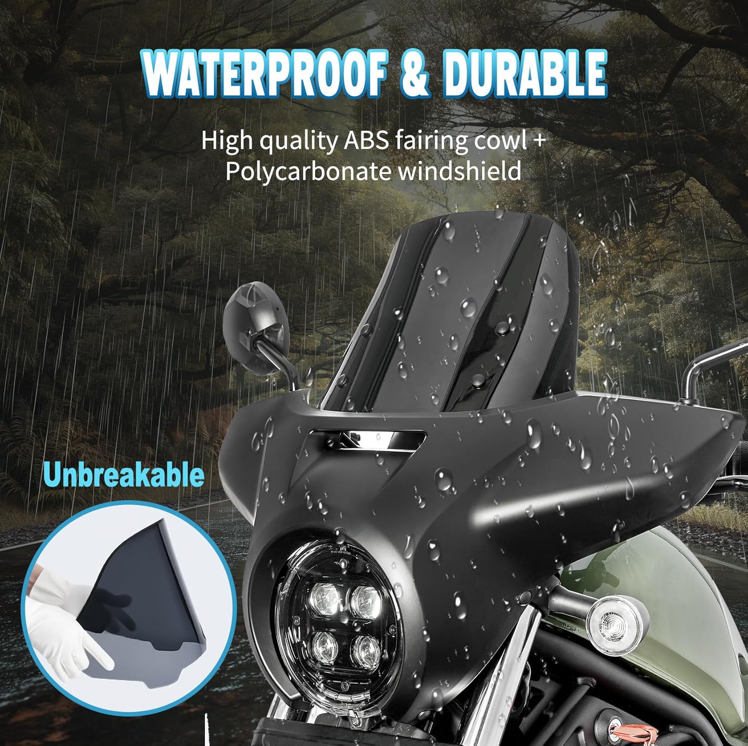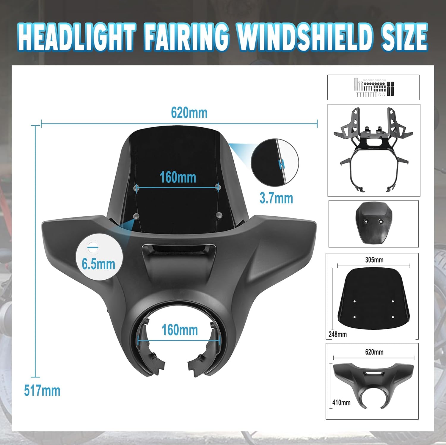 | Included Components | 1 Piece Headlight Fairing Cowl, 1 Piece Windshield, 1 Set Mounting Bracket, 1 Set Mounting Hardware Screw Kit |