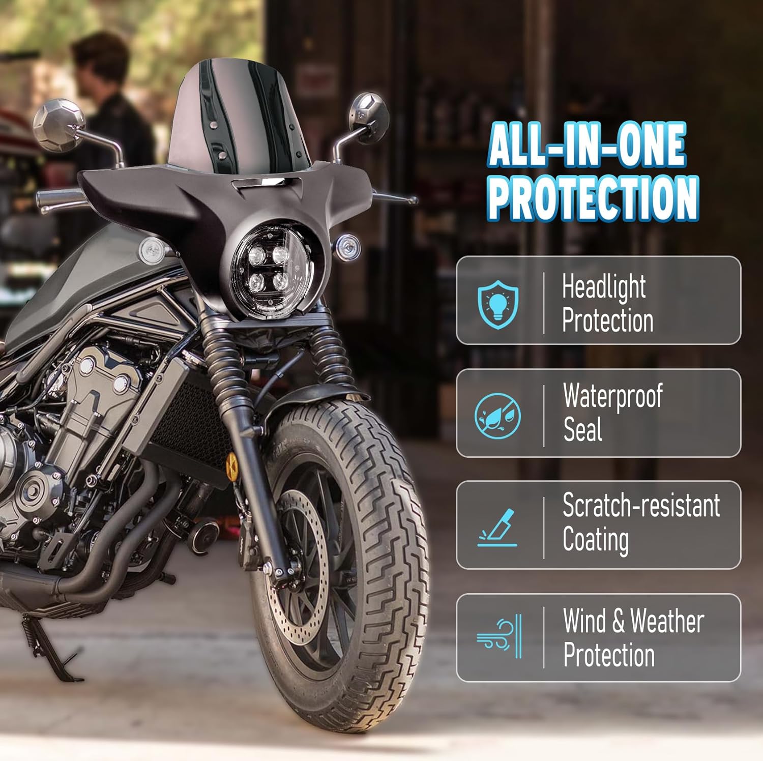 Product Name: Motorcycle Headlight Cowl Fairing with Windshield Deflector Compatibility: Compatible with CMX 300 2020 2021 2022 2023 2024 Compatible with Rebel CMX 300 2020 2021 2022 2023 2024 Compatible with CMX 500 2017 2018 2019 2020 2021 2022 2023 2024 2025 2026 Compatible with Rebel CMX 500 2017 2018 2019 2020 2021 2022 2023 2024 2025 2026 Condition: Aftermarket 100% Brand New Fairing Material: ABS Resin Headlight Mount Material: Iron Windshield Material: Polycarbonate (PC) Thickness: About 4mm Size: Approximately 20.35" x 24.41" (51.7 x 62 cm) (Height x Width) Color: Glossy Black+Clear, Glossy Black+Black, Glossy Black+Transparent; Matte Black+Clear, Matte Black+Black, Matte Black+Transparency (Optional) Functions: Sleek, racy styling and sweeping lines define this innovative fairing. The detachable design gives your bike a whole new sporty look that can be hanged in an instant. Combines exceptional style and protection. Less turbulence improves stability and performance, and decreases fatigue in your hands, arms and chest. Made of high quality auto grade injection molded ABS plastic for strength and durability. 9.76” Windshield Windscreen: High-Grade, High-tech impact-modified acrylic windshield can protect motorcycle riders enthusiast from the wind, thrown-up rocks, debris, and bugs. Windscreen will deflect more wind for a more comfortable ride, makes a more relaxing and safer ride. Packing List: 1 Piece Headlight Fairing Cowl 1 Piece Windshield 1 Set Mounting Bracket 1 Set Mounting Hardware Screw Kit