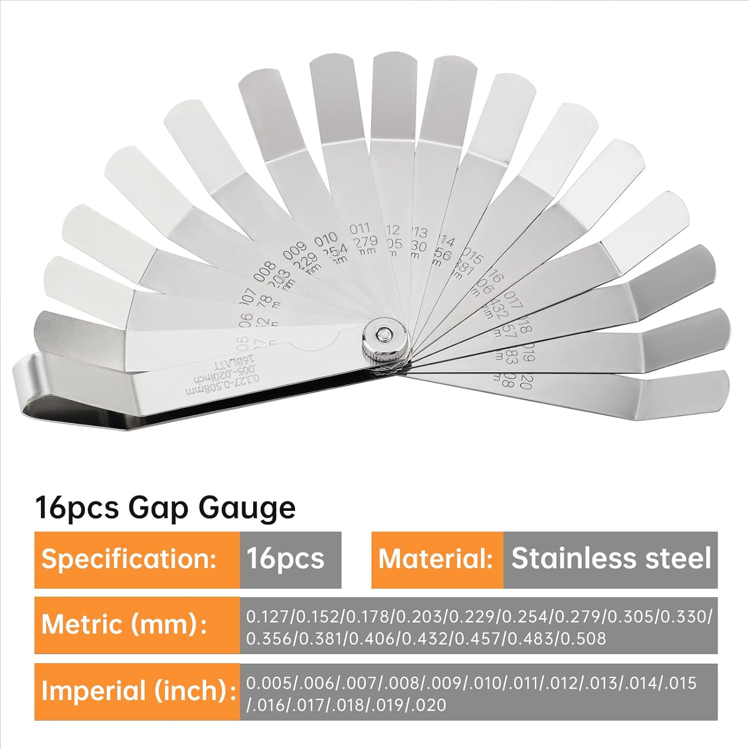 This 16-blade offset feeler gauge set allows for precise valve clearance adjustments in internal combustion engines. Each blade features engraved, easy-to-read numbers in both metric (0.127 - 0.508 mm) and imperial (0.005 - 0.020 inch) sizes, so you can work with the measurement system you prefer. The stainless steel blades are held securely in two included plastic handles for a safe grip. To use, simply select the correct blade, insert it into the handle, and check the gap between the valve tappet and stem. When finished, the blades fold neatly into the handles for compact, protected storage. This set is an essential tool for motorcycle, automotive, and small engine maintenance. Specifications: Blade Material: Steel Handle Material: Plastic Measurement Range: 0.005 - 0.020 inch / 0.127 - 0.508 mm Blade Count: 16 Product Weight: 11.11 oz (315 g) Product Dimensions: 4.33" x 1.97" x 1.18" (11 x 5 x 3 cm) What's Included: 1 x Offset Feeler Gauge with 16 Blades 2 x Plastic Handles 1 x Screwdriver