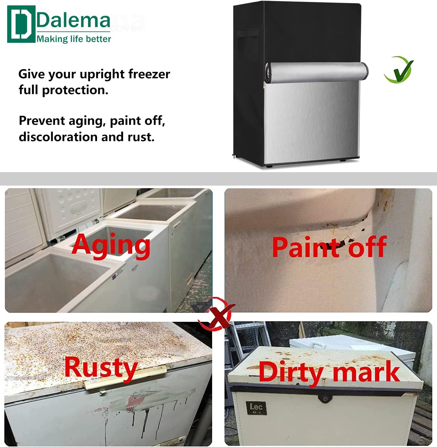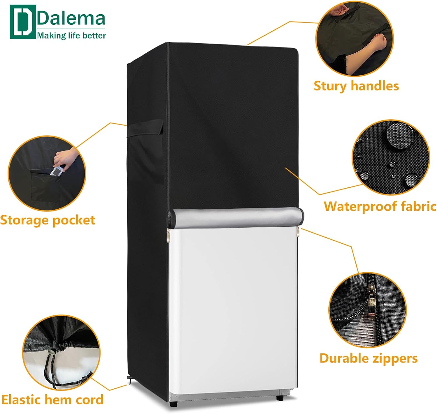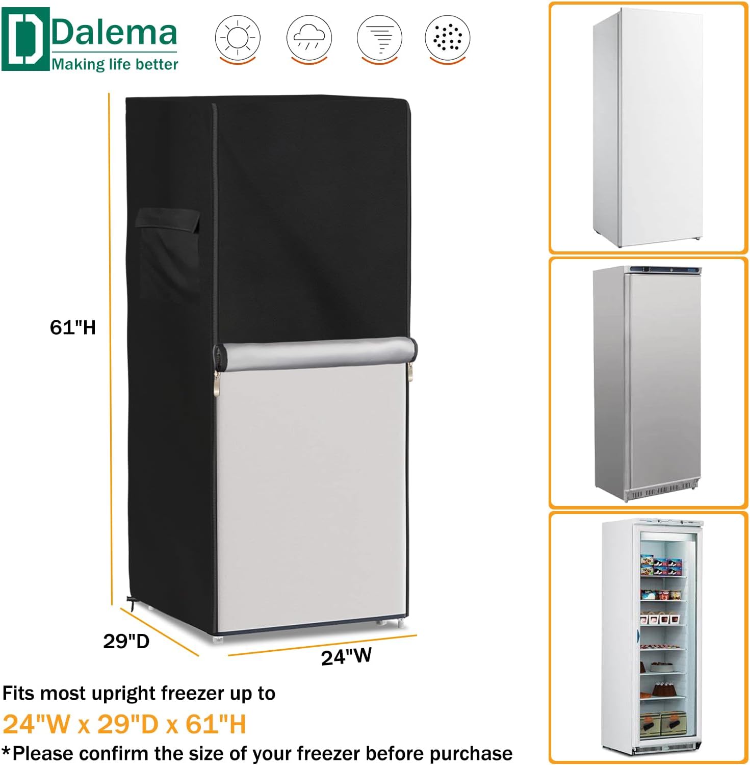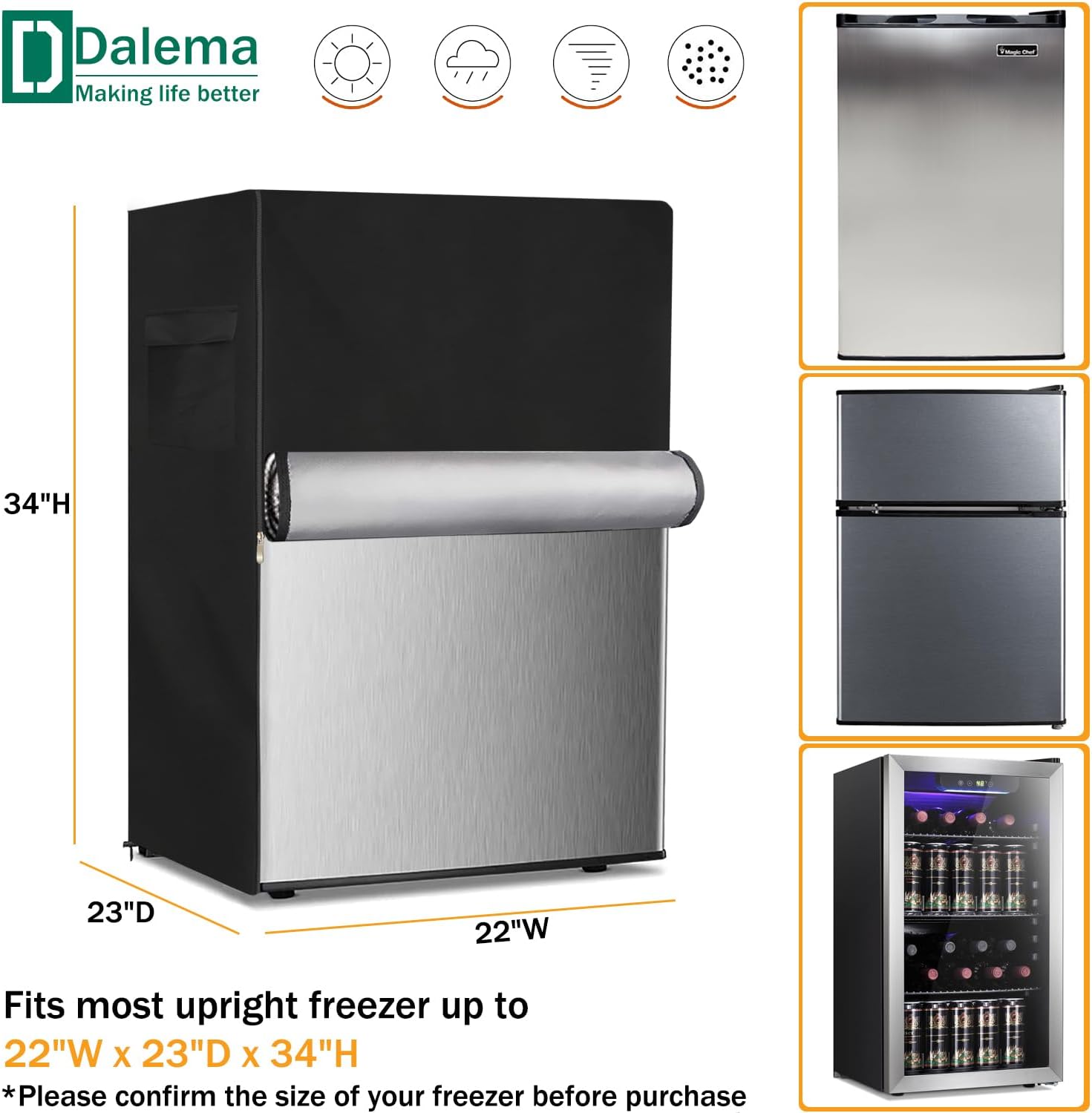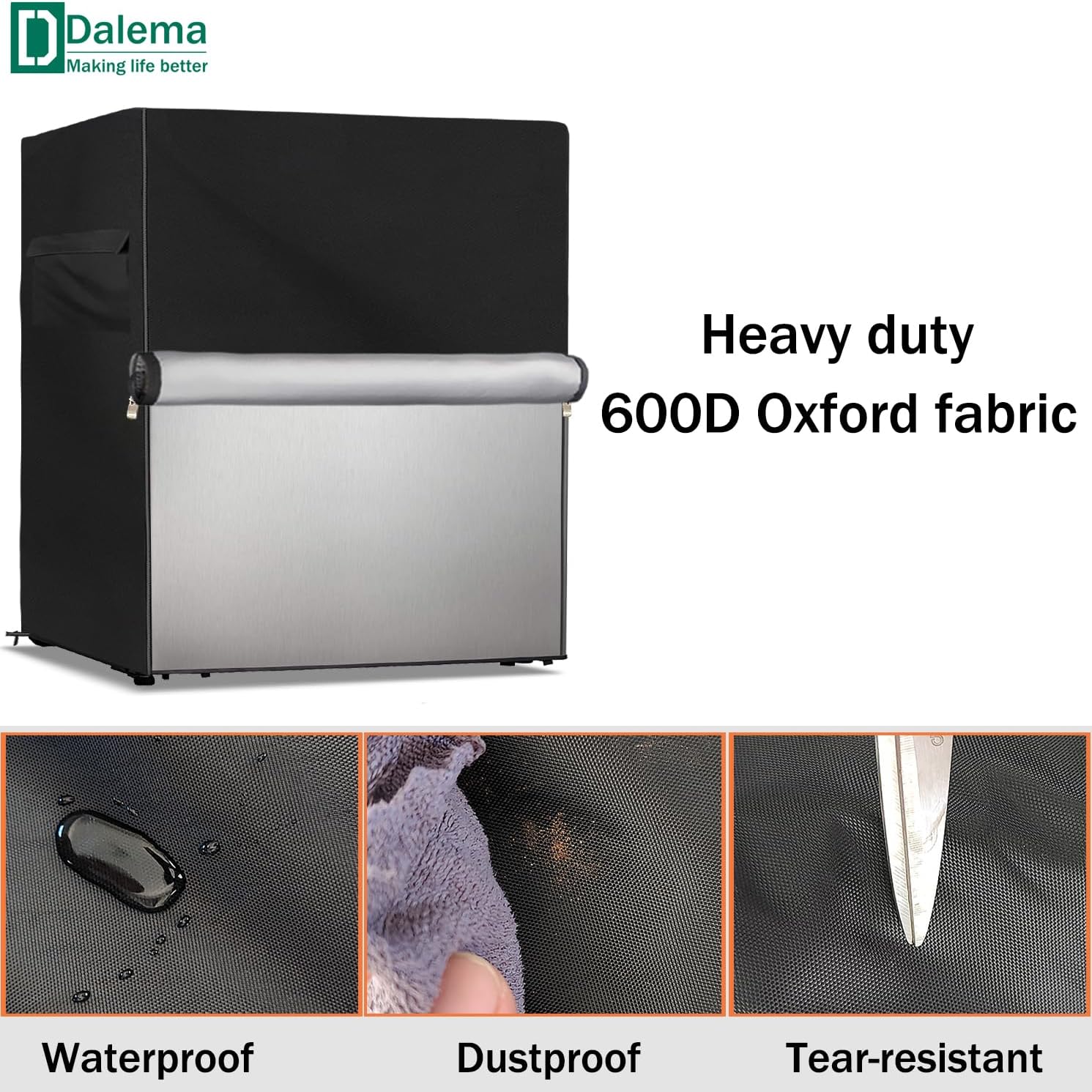 Size:30" W x 33" D x 62" HColor:BlackFabric:Heavy duty waterproof 600D Oxford fabric with double needle suture and sealed seamsThis outdoor refrigerator cover is compatible with most refrigerator,upright freezers,stand up fridge,beverage refrigerator of this sizeIt is made of heavy duty waterproof 600D Oxford fabric,which is studry and waterproof,it can protect your refrigerator from rain,sun,dust,leaves and dirt,keeps it dry and cleanOur outside refrigerator covers has designed 2 strong handles on the side,you can easily to install and remove it.And the bottom of the outdoor refrigerator cover has an elastic hem cord,back has 2 adjustable buckles,you can fix the cover on the refrigerator closely,it will not be blown away in windy days