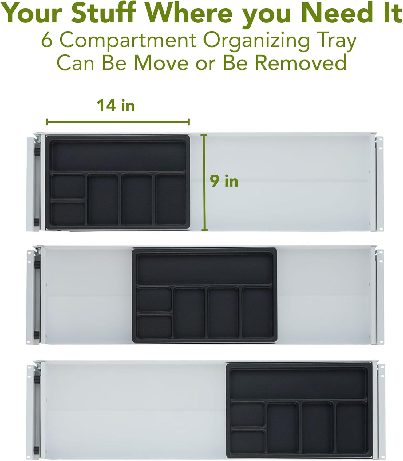 | Other Special Features of the Product | Movable Interior Tray, 6-Compartment Organizer, Smooth Glide Ball-Bearing Tracks, Soft and Quite Close, Unique Lock and Key, Fits 30"+ Desk, Smooth Face, Flush Mounted |