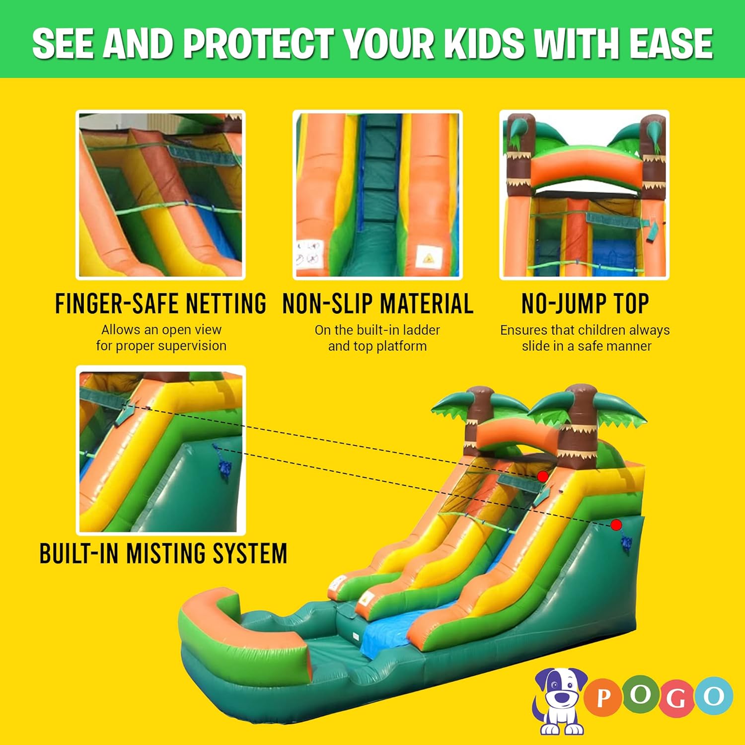 Say hello to an ultra high quality inflatable water slide without the commercial grade price tag! The all-new 12' Tropical Crossover Kids Inflatable Water Slide with Blower features ultra-fun water slides that were engineered specifically for residential usage. Standing at 12' tall and 21' long, it is sure to be super duper fun for kids and adults alike! Our kids water slide can even be used without water for an equal amount of fun. Our water slide is equipped with non-slip climbing surfaces and no-stand netting at the top of the unit for added safety. The top quality of our blow up water slide will give you the peace of mind of having a sound and safe structure that puts your child's safety first. Our kids water slide wasn't just well designed, but they were put together with at-home use in mind, combining everything you need. Crossovers are great starter units for people looking to test the rental market on a small budget or awesome for families looking to save money by owning over renting. Our kids water slide comes complete with a quality blower, durable storage bag, anchor stakes, and vinyl patches and inflates in a fast two minutes! Includes a 90 day limited warranty on the inflatable and a 1 year limited warranty on the blower.
