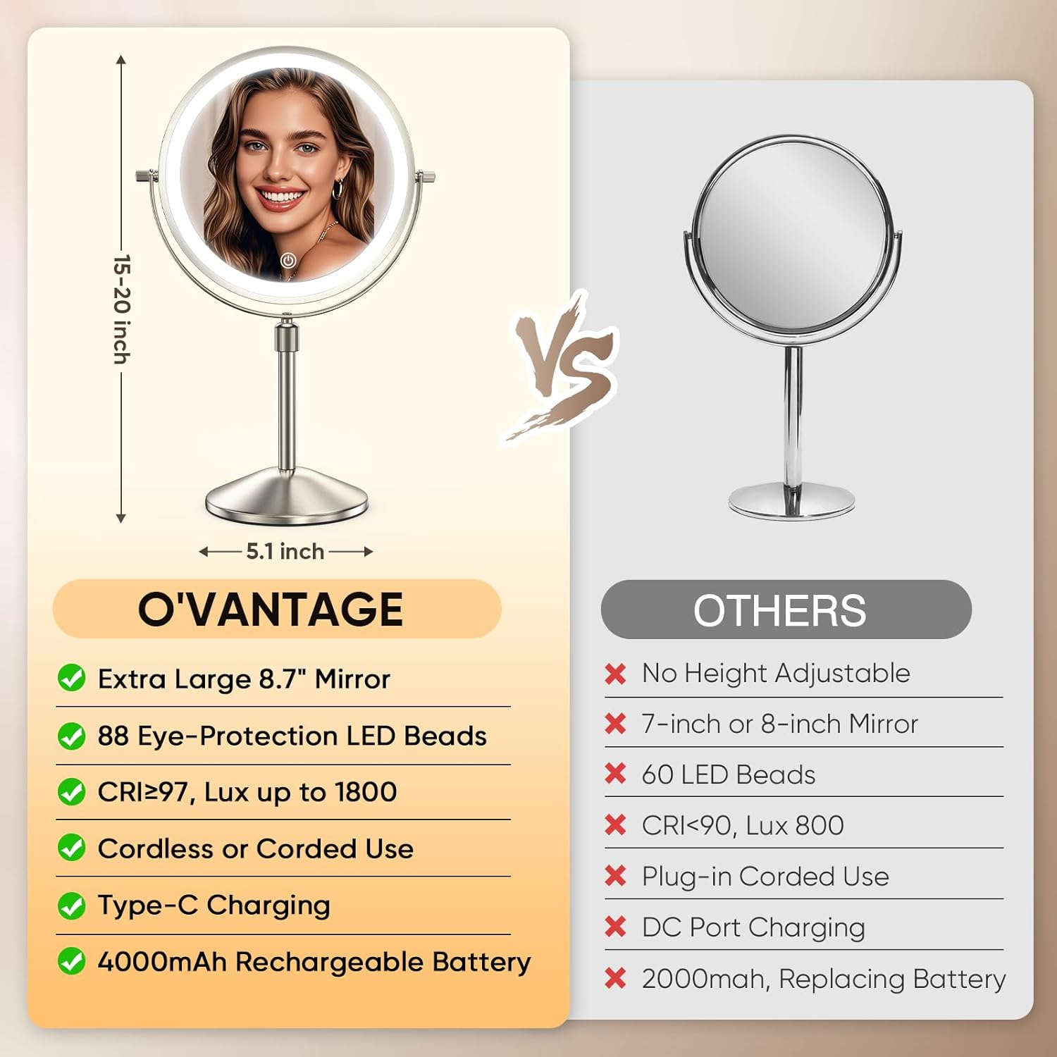 | Additional Features | 2-Sided Lighted 8.7" Mirrors, 1x/10x Magnifying,, 3 Colors Light & Brightness Adjustable, CRI>97 Premium LEDs,, 30-min Auto-off, Memory Function, 4000mAh Premium Rechargeable Battery,, Height Adjustable 15"-20", |