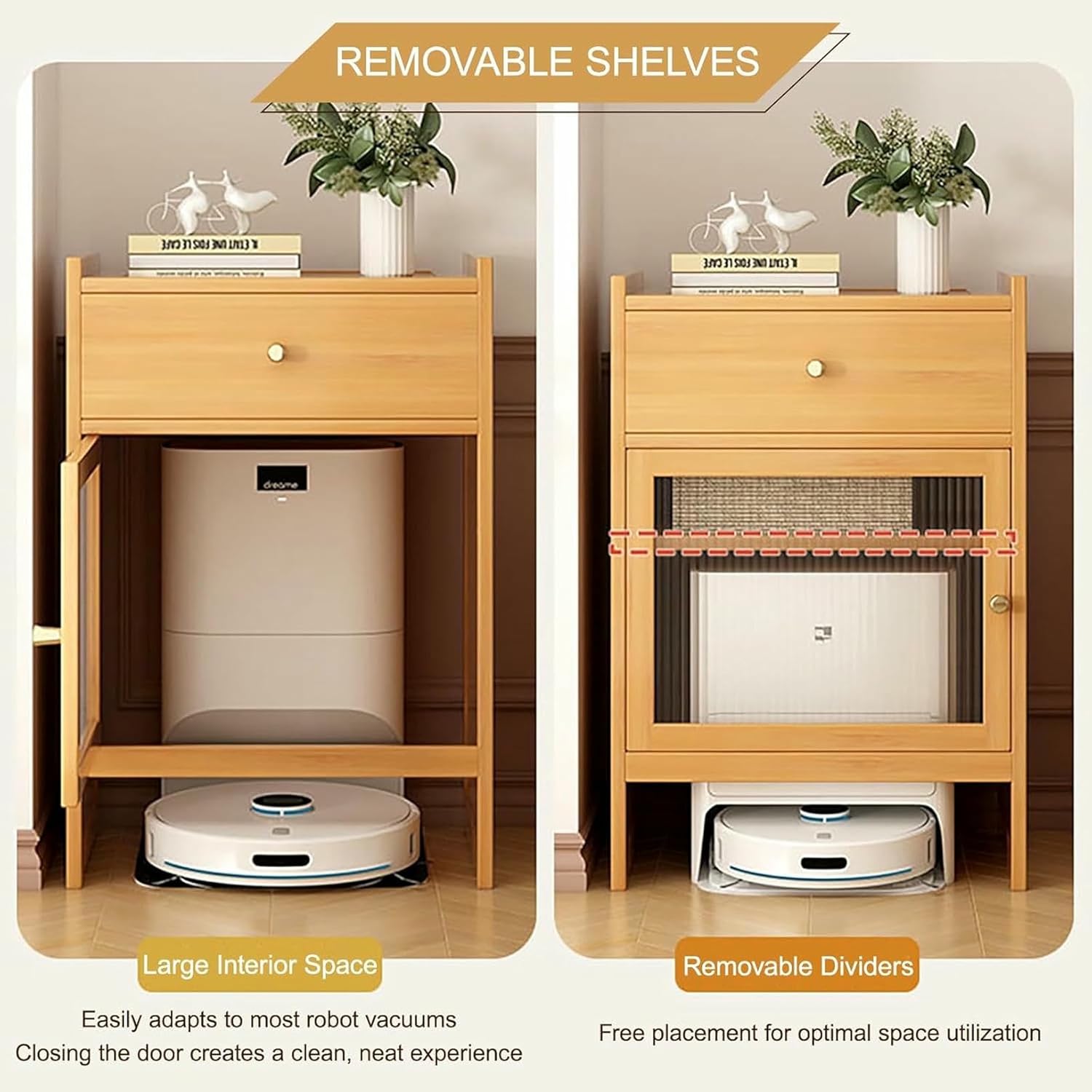 >>>Made of thickened boards and acrylic doors, this vacuum storage cabinet features ample storage space and removable shelves, providing flexible storage for a variety of daily necessities.>>>The storage cabinet is spacious and provides not only a dedicated area for storing the sweeping robot, but also space for other items. The detachable shelf design provides you with a variety of storage needs.--Spacious cabinet with drawers and shelves for daily storage--Spacious area fits most robot vacuum models.--Wide top surface doubles as décor or everyday essentials area--The acrylic door bookcase includes transparent doors, allowing clear visibility of stored items--Its versatile and stylish design makes it suitable for any room, blending well with modern interiors.>>>Specification--Product Name: Modern Robot Vacuum Storage Rack--Material: Bamboo + Acrylic Door + MDF--Storage Area: Top Display, Drawers, Removable Shelves, Storage Cabinets with Doors--Dimensions: 52 x 40 x 80.5 cm / 20.5 x 15.7 x 31.7 in--Assembly Required: Yes