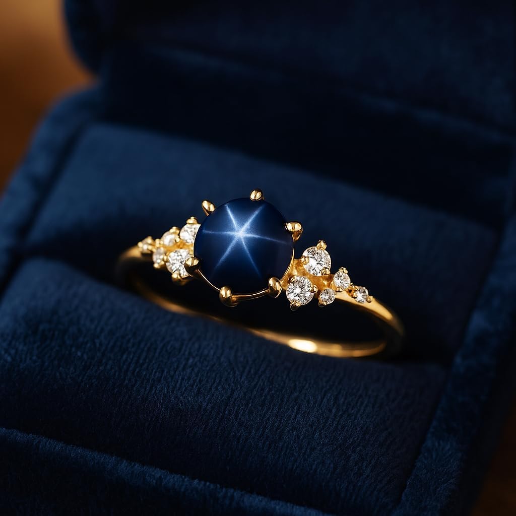 This Round Blue Star Sapphire Ring is a timeless blend of elegance and minimalism. The smooth cabochon-cut gemstone displays a stunning star-like reflection, making each ring visually captivating. Set in 10K yellow gold, the solitaire centerpiece is accented with delicate diamond side stones for a subtle touch of sparkle. Perfect as an engagement ring, promise ring, or anniversary gift, this piece is designed for women who appreciate understated luxury and unique gemstones. Its dainty profile makes it comfortable for everyday wear while remaining effortlessly elegant.