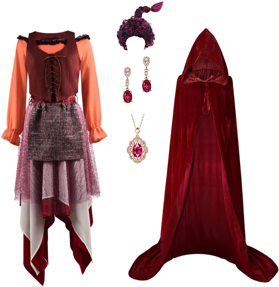 Sanderson Sisters Costumes Dress Winifred Sanderson Sarah Cosplay Dress Women Mary Cape Skirt Earrings Wig for Halloween This set is a one-to-one reproduction of the protagonist's style in the movie. Put it on and become your own star! Made of durable and breathable materials. The clothes are durable, neither loose nor shrunken, and can withstand multiple wear and tear from all sides. The clothes offer a smooth and comfortable fit, making them suitable for all seasons. Due to the different measuring tools used, there may be an error of 1-2cm. You can choose the size according to your own situation.