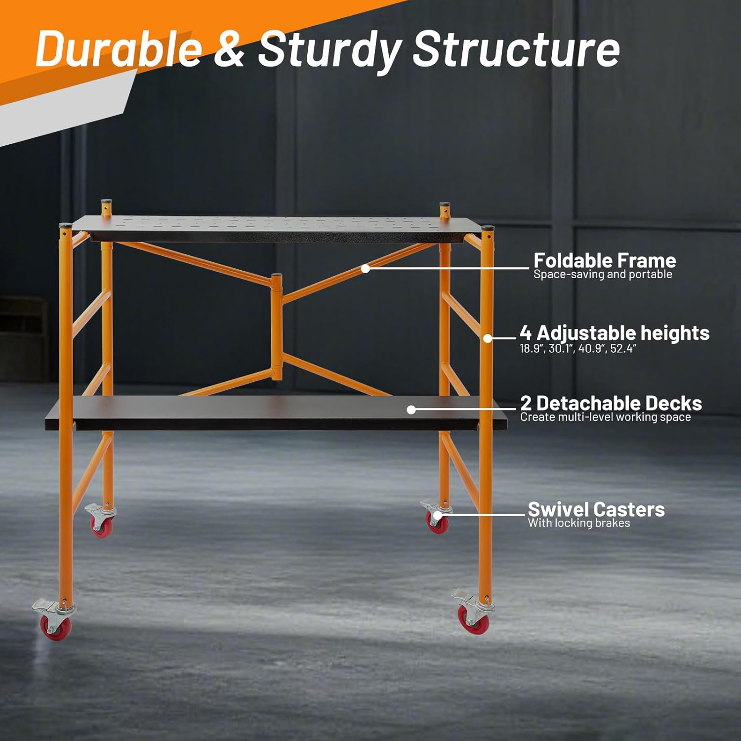 9.5FT Scaffolding PlatformProduct DescriptionExperience unmatched versatility and efficiency with our premium scaffolding platform, designed to meet the demands of your decoration, construction, and wall maintenance projects. Measuring 49.2 inches (125cm) long, 25.2 inches (64cm) wide, and 53.5 inches (136cm) high, this double-layer platform offers an expansive and comfortable workspace that maximizes your productivity.Equipped with four lockable casters, this foldable scaffolding ladder allows for effortless mobility, ensuring you can adapt to any work environment with ease. Whether you're working on intricate home decorations or large-scale construction projects, its robust design supports up to 800 lbs, providing a stable and secure platform for all your needs.The portable and foldable design makes storage and transportation a breeze, while the sturdy construction ensures long-lasting performance. Elevate your projects with this indispensable tool, perfect for professionals and DIY enthusiasts alike. Transform your work experience with our reliable and versatile scaffolding platform.Product Specification(Due to manual measurement, there may be 2-3cm error!)Size: 49.2"W x 25.2"D x 53.5"HLoad Capacity: 800 lbsColour: OrangeMaterials: Steel