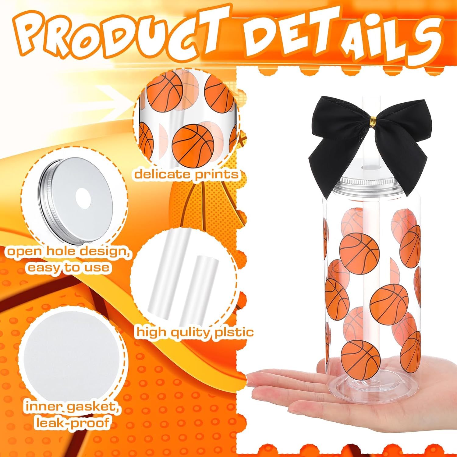 Features: If you are looking for a meaningful gift to show your team spirit, or if the player in your life has a birthday, Thanksgiving Day or other special day, this beautiful and stylish sports souvenir is a good gift for friends, daughters and teammates This basketball themed cup is designed for basketball players and basketball enthusiasts. It uses classic basketball patterns on it. The design is and exquisite, eye catching, creative and attractive Specifications: Material: plastic Basketball cup: plastic Color: basketball style Size: Basketball cup: about 400 ml/ 13.5 oz Package includes: 20 x Basketball plastic cups 20 x Basketball bracelets 20 x Bows Manual measurement, please allow slight errors on size. The color may exist a slight difference due to different screen displays