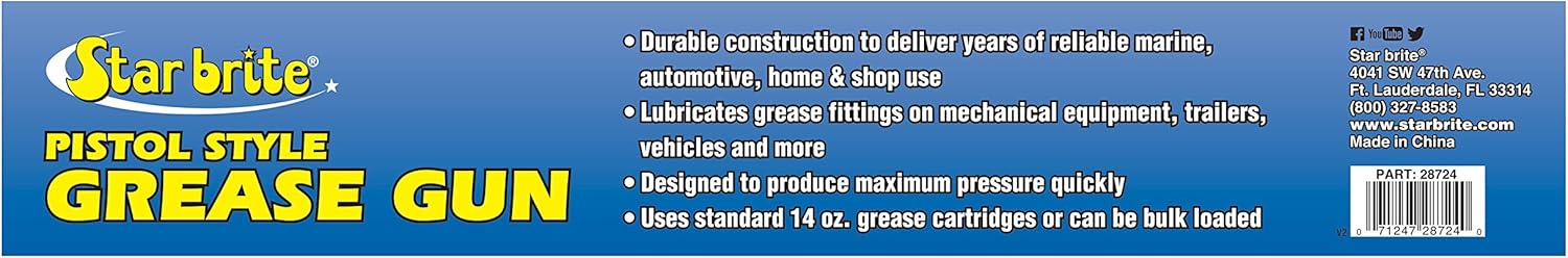 The STAR BRITE Standard Duty Pistol Grease Gun is your reliable companion for all lubrication tasks. Engineered to deliver consistent performance, this grease gun is compatible with 14 OZ. cartridges, making it perfect for both professional mechanics and DIY enthusiasts. Designed with a corrosion-resistant finish, it stands up to tough environments, ensuring longevity and durability. Ease of use is a hallmark of this grease gun, with a design that allows for one-handed operation, so you can get the job done quickly and efficiently, even in tight spaces. The STAR BRITE Grease Gun is equipped with a secure grip handle, reducing hand fatigue during prolonged use. Its compatibility with standard Zerk fittings ensures that this tool is versatile and ready for a wide range of applications, from automotive maintenance to industrial machinery lubrication.
