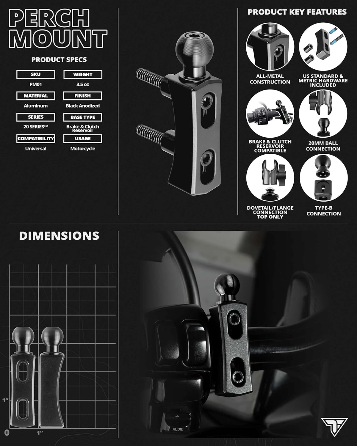 Tackform Black Motorcycle Perch / Brake / Clutch Reservoir Device Mount | Billet Aluminum | Hardware Included | 20mm Ball | Compatible with Harley-Davidson, Gold Wing, Honda, More | Various Models