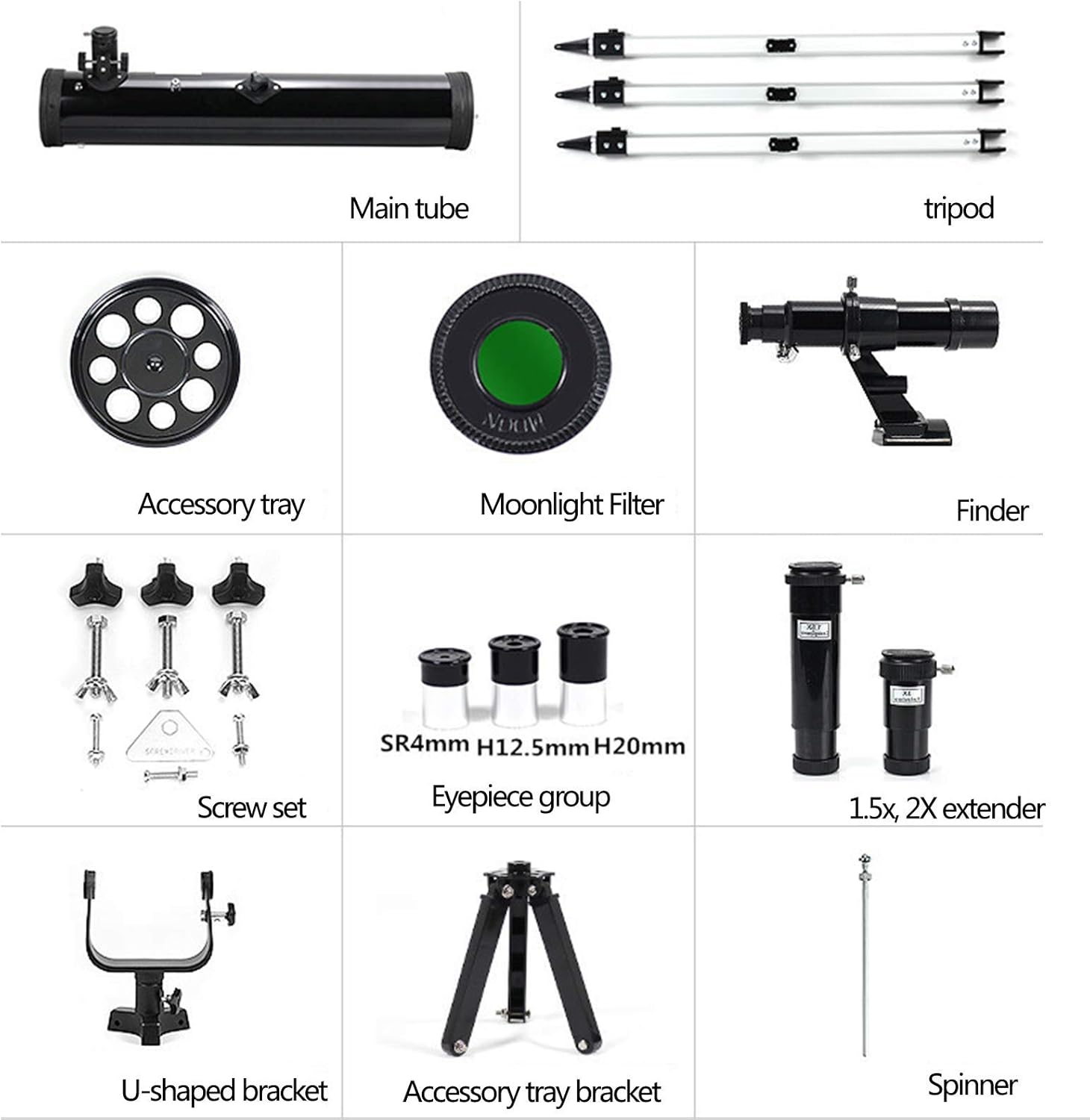 FEATURE: ❤76mm Telescope Is Very Suitable For Scientists And Travelers To Conduct Terrestrial Astronomy Observations Interested In Beginners, Teenagers, Children, Travelers, Students, Or Have More Knowledge About The Night Sky. ❤Easy To Carry Refracting Telescope And Lightweight Adjustable Aluminum Tripod,Packed In A Bag, It Is Very Convenient For Young Stargazers And Families To Watch The Stars Anytime, Anywhere. SPECIFICATION: Optical system: reflective Optical coating: full surface antireflection coating Main barrel diameter: 76mm Focal length: 700mm Eyepiece: H20mm /H12.5mm/SR4mm Extender: 1.5x/2x Finder: 5x24 optical zoom Multiple: 35x/52x/ 105x/56x/ 84x/168x/ 175x/263x/525x Tripod: Aluminum bracket Coke ratio: F9.2 Length of primary mirror: 700mm Light collecting power: 18.4 Resolution: 2.31 arc seconds Field of view: 1.2° Weight: 5.5kg PACKING LIST: 1*Primary mirror 3*Eyepiece 1*Forward mirror 2*Extender 1*Moon filter 1*Aluminum alloy tripod 1*Accessory tray 1*Accessory tray bracket Your Satisfaction Is Our Top Priority, If You Have Any Questions, Please Feel Free To Contact Us, We Will Serve You As Soon As Possible!