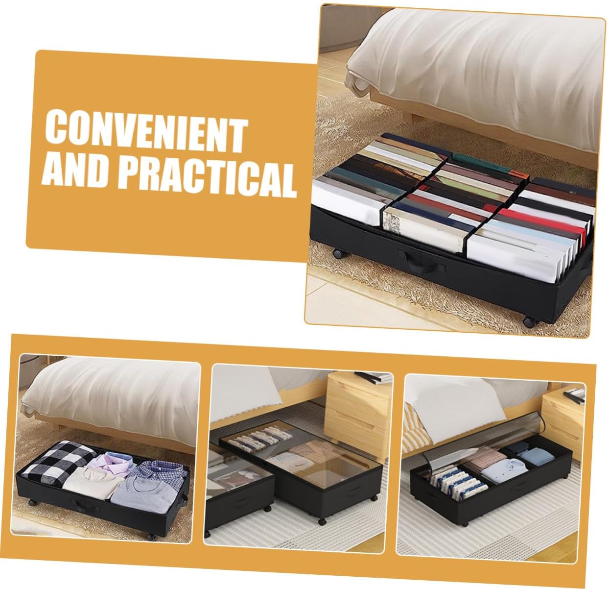 Package Include 1 x Under Bed Storage Bag Characteristics -Material:ABS, oxford cloth, iron -Dustproof organization: prevents dust and dirt, keeping your items clean underbed organizer. -Product Info:Under-bed storage truck -Size:80.00X42.00X16.00cm/31.44X16.51X6.29in -Underbed storage: utilize the space under your bed to increase storage space underbed storage rack. -Color:Black -Convenient sliding design: easy mobility and access to your stored items with the wheels deep under bed storage container. -Ample storage capacity: three-grid design allows for storing bed sheets, clothes, , and more large capacity clothes storage bag. - oxford cloth material: convenient and easy to clean for use.Goods Informationstorage containers for under bed The under bed storage container is not easy to tear, can keep it for a long time.storage bin under bed If you are looking for a storage bag for under bed with reliable material, I will tell you that our storage bag will be your choice
