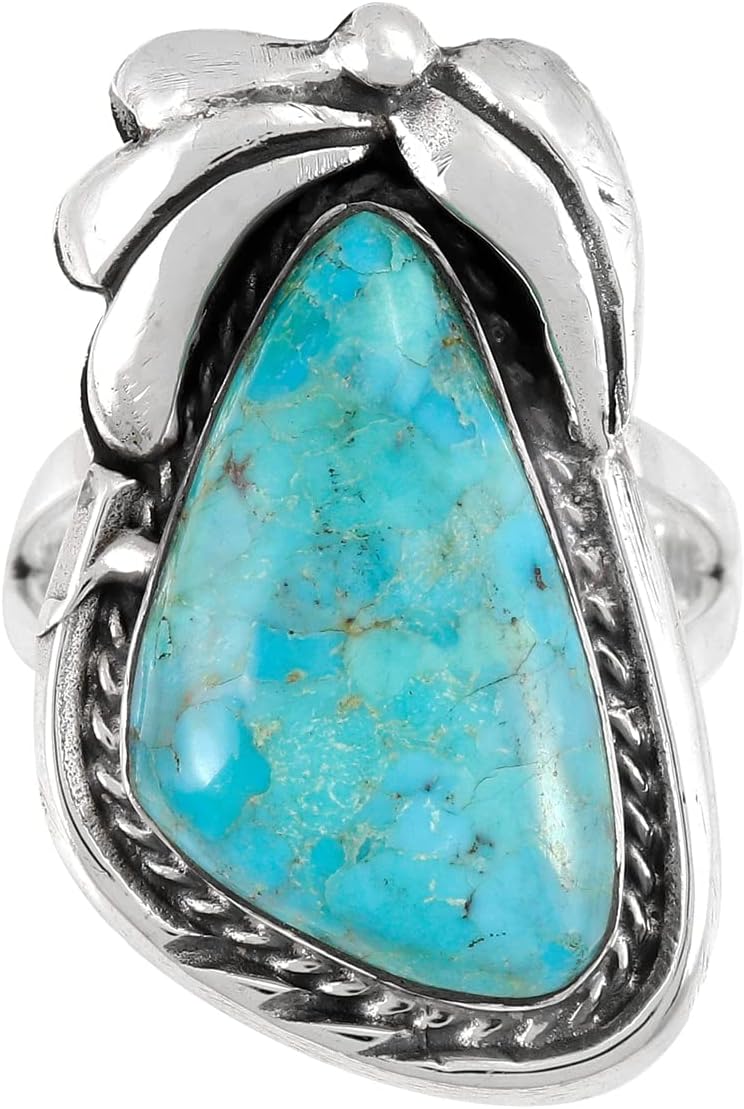 Traditional Southwest-style leaf design ring for everyday wear or that super special occasion. Made of solid sterling silver & genuine gemstones. Fine craftsmanship.Dainty, lightweight, and so much fun! Approx. 1/2" wide x 1.5" long (see ruler image).NOTE: Due to the nature of these gemstones, variations in colors/shades and minor imperfections are normal (and may be DRAMATIC). Our turquoise and coral have been stabilized, treated, and color-enhanced for beauty and durability. Imported