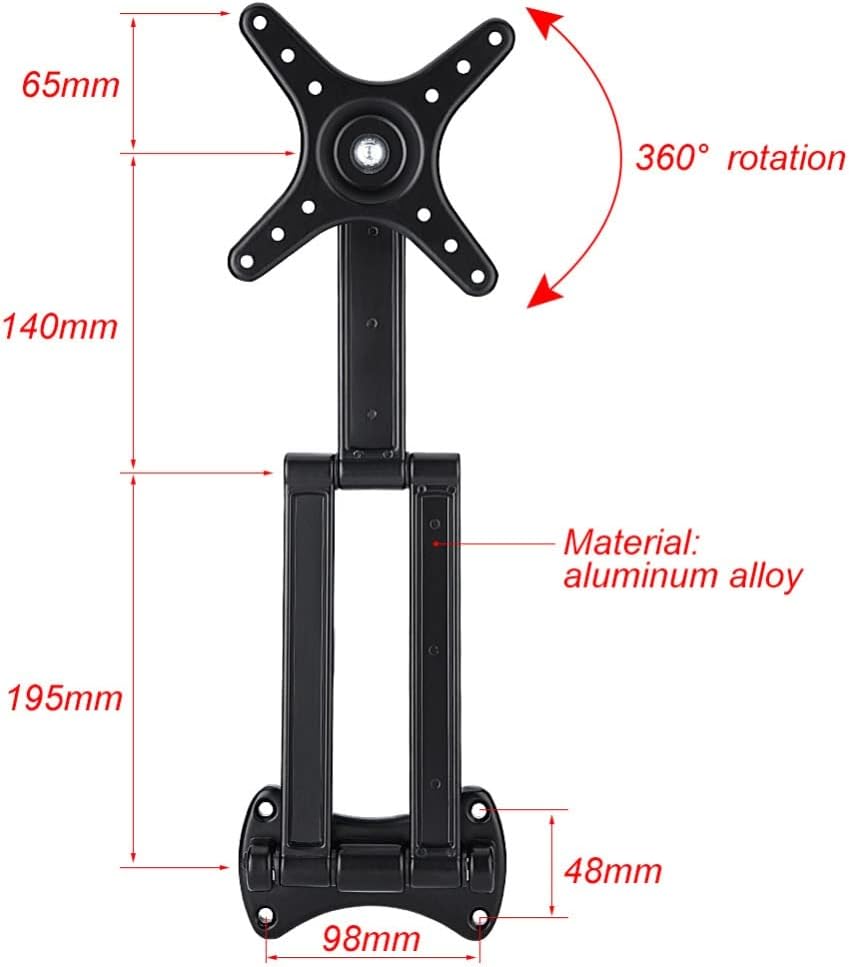 The bearing load tested is up to 10kg.This TV bracket is compatible with flat TVs between 10" and 27" screens.Supports VESA Compatible 50x50mm, 75x75mm, 100x100mm.Once mounted, the bracket's tilt and swivel can be easily adjusted to achieve the most comfortable viewing angle. Made of aluminum alloy material, the wall bracket is extremely strong.Specifications:VESA: 50x50mm, 75x75mm, 100x100mmMaximum load: 10kgdistance from the wall: 400mmSuitable TV size: 10" - 27" flat TV screenTilt up and down angle: ± 90 degreesLeft and right adjustment: ± 90 degreesMonitor adjustment: vertical screen, horizontal screen, clockwise, counterclockwise rotation 360 degreesMaterial: aluminum alloyColor: BlackPackage List:1 x Wall Bracket1 x Screw PackNote:Please check the hole distance of your TV before you order.