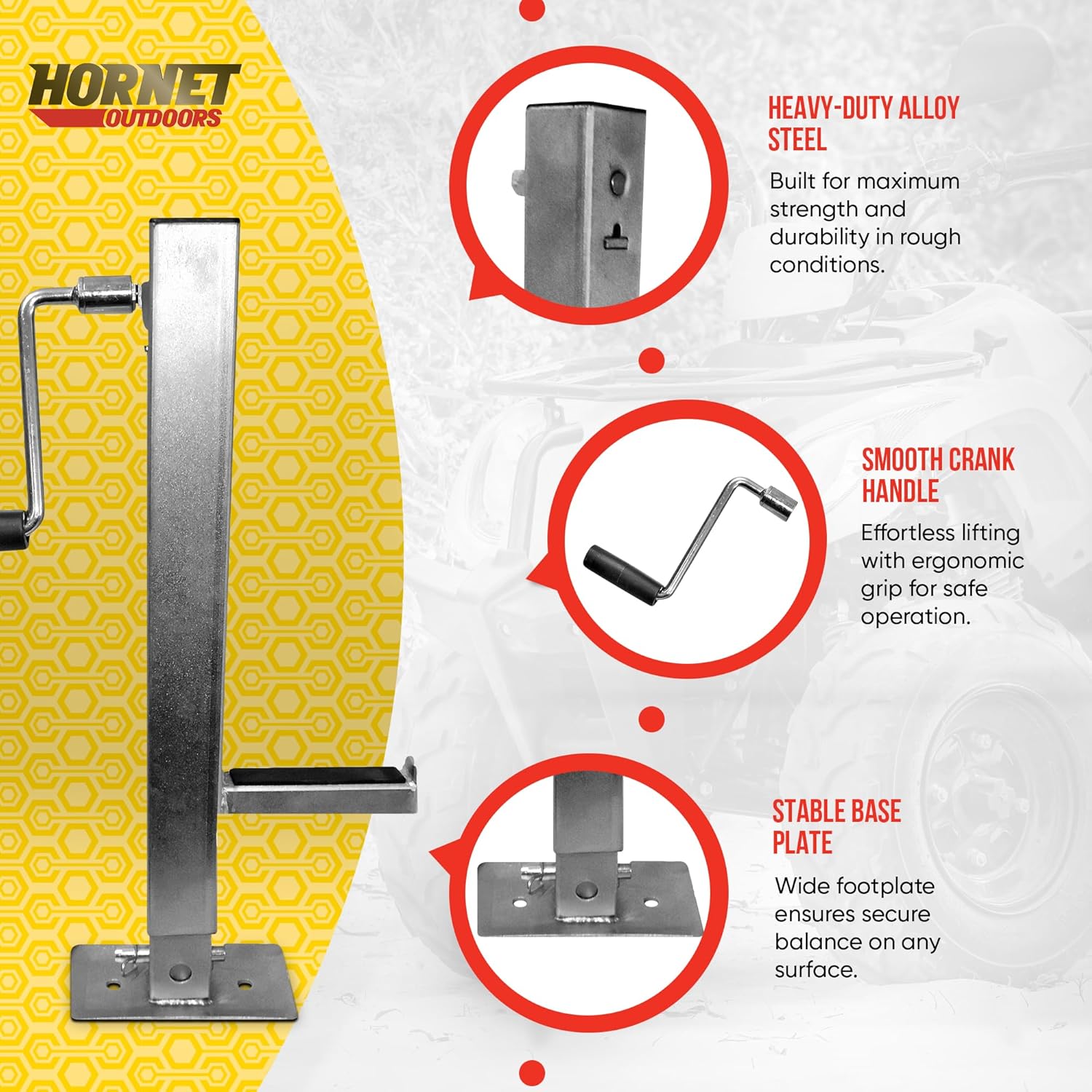 Designed for off-road adventures, the Hornet Max Lift Jack is a versatile and powerful jack built to handle tough terrain. Its robust construction and high lifting capacity make it ideal for UTVs, ATVs, and even small vehicles. High Density Sand Foot Allows for additional stabilization in soft ground such as mud or sand. Non Swivel design assures maximum stability in sloped or uneven terrain. Superior Stability: Non-swivel design ensures secure footing on uneven ground. Versatile Mounting: Easily attaches to round roll bars or bumpers using machined aluminum clamps and rubber grips. Multiple Lifting Positions: Mount vertically, horizontally, or upside down to suit your needs. High Capacity and Long Reach: Lifts up to 2,500 pounds with a telescoping leg extending from 7" to 40". The Hornet High Lift UTV Jack is the perfect jack to carry on your UTV. Quick Lift Jack is designed with a large foot and assures a good foothold. Comes with Crank Handle or use a cordless drill. 8" Long lifting arm. Up to 38" Lift Height Weatherproof Galvanized finish Weighs only 18 lbs. 8" long lift tongue allows plenty of reach This handy universal jack will also lift your ATV or UTV or Trailer for changing tires and wheels. U-5500 Extra Tall 2,500 lb ATV/UTV Jack The Hornet Outdoors Universal Quick Lift Jack was designed for off-road ATV/UTV use and also makes a great jack for your snowmobile or ATV/UTV Trailer. It is lightweight, has a high capacity and long extension range, and is simple to use. Operate with the included crank handle, or remove the handle and use a ratchet or cordless drill. It will easily lift your ATV, UTV, trailer, or other small vehicle. You'll find plenty of other uses for this versatile jack. Change the wheels on a trailer, raise a dock for repairs, change your riding mower blades, and more! Extra Tall:- 2,500 pound lift capacity - 7"-38" extension range via telescoping leg - 20” of Lifting Range at each hole stop on the drop-down Leg - 8" lift tongue - 23 pounds - Only 27" Long when completely contracted. - Weatherproof galvanized finish
