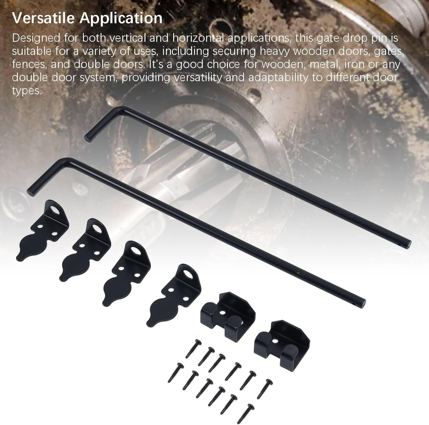 [Convenient Storage Design] When not in use, the innovative retainer keeps your drop rod neatly stored and easily accessible. this thoughtful feature prevents loss or misplacement while maintaining a clean appearance. the retainer system ensures your gate hardware stays organized and ready for immediate use whenever security is required. [Easy Installation & Operation] Includes straightforward installation instructions and 12 self drilling screws for quick setup. simply drill 12 holes and secure the 4 brackets to any wooden post or metal pole. the intuitive design allows for effortless operation - just manually turn the rod to slide it through the bracket holes into the ground for instant secure locking when needed. [Heavy Duty Performance] Engineered to handle substantial weight and frequent use, this gate cane provides exceptional holding power for large, heavy gates. the extended 18 inch length offers superior anchoring in various soil types, while the reinforced carbon steel construction guarantees reliable performance under constant stress and pressure. [Durable & Weatherproof Construction] Crafted from premium thick grade black carbon steel and finished with a resilient black powder coating, this drop rod gate stopper is built to withstand the harshest outdoor conditions. the robust construction prevents rust and oxidation, ensuring long lasting durability and reliable performance year after year even in extreme weather environments. [Versatile Security Solution] Designed for both vertical and horizontal applications, this heavy duty gate latch provides secure locking for various door types including wooden, metal, and iron gates. the 18 inch drop rod offers deeper ground penetration for enhanced stability, making it perfect for securing double gates, fences, barn doors, and other outdoor entry points against wind and unwanted movement. Spec: Item Type: Gate Ground Latch Material: Carbon Steel Application: Wood Fence