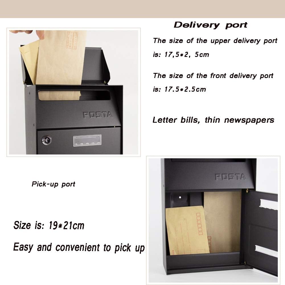Product Name: mailboxProduct material: Galvanized sheetProduct size: 21x9x32.5cm;Product weight:1.4kgDelivery port:17.5x2.5cmColor: blackApplication: letter notes, thin magazine.Stylish European retro villa mailbox is perfect for villa, outdoor, school, community, family, can be installed anywhere, convenient for your lifeThe product contains a mailbox, and the rest are shooting props, not included in the product.Note: 1.Manual measurement, there are slight errors; please refer to the actual items received, so as not to interfere with the imagination2.Due to some unavoidable reasons such as lighting, display, etc., the color will have some color difference, please understand3. If you have any questions, please contact us, we will reply to you within 24 hours.