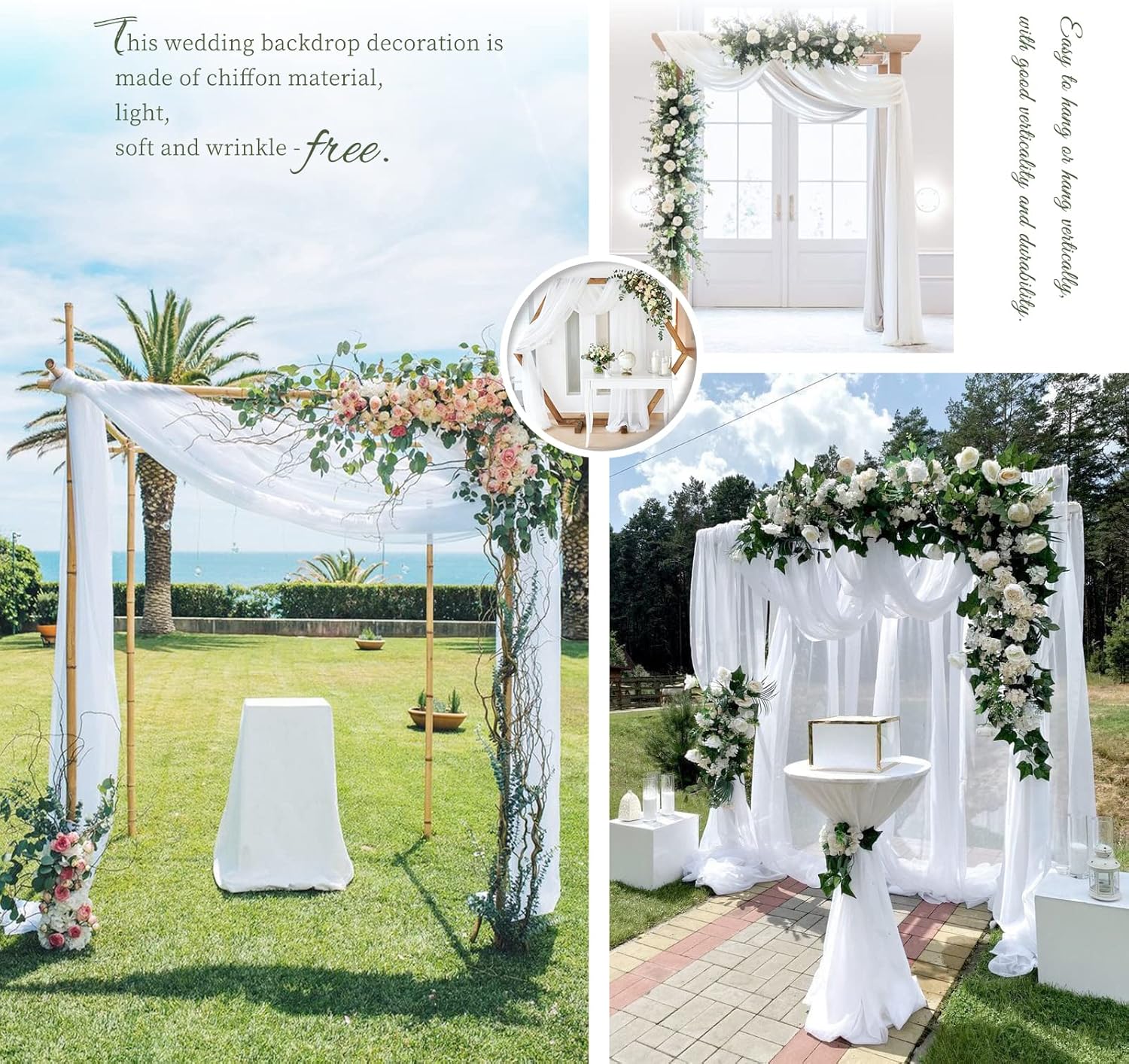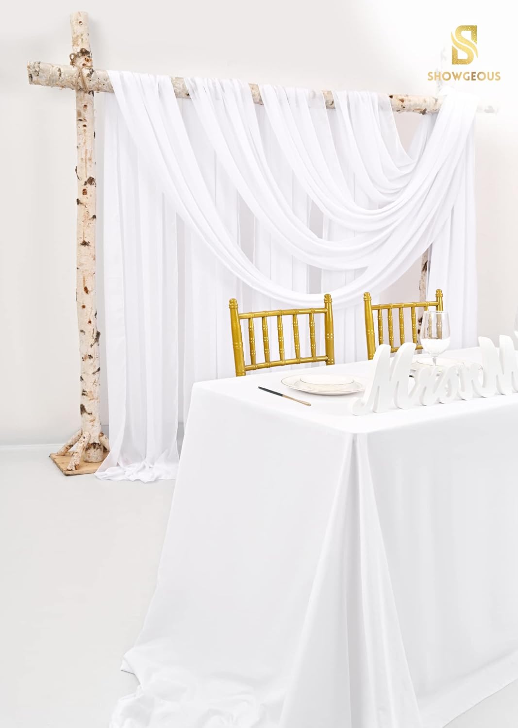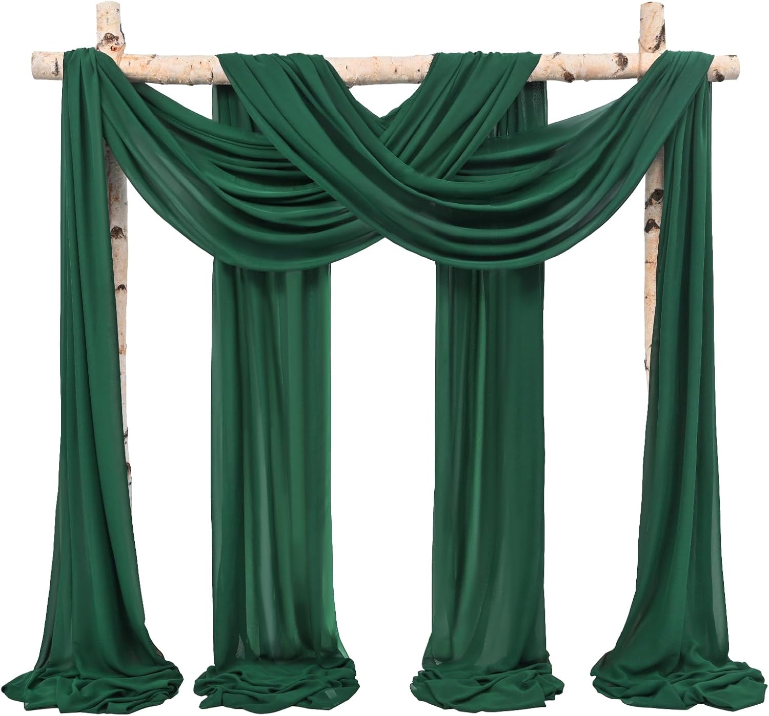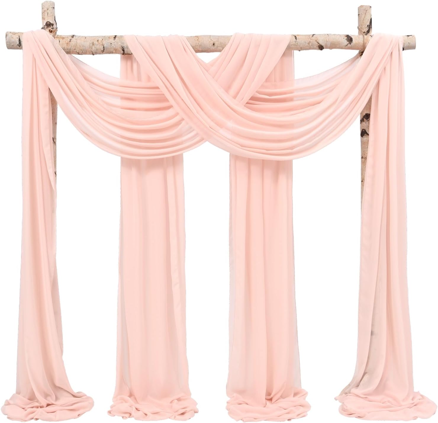 White Wedding Arch DrapesQuantity: Set of 8 panels, each panel is 28 inches wide by 18 feet long.Fits for 5-7ft arch/arbor.Soft Material: 100% chiffon fabricEasy Draping or Hanging Arch DrapesSoft to the touch, solid color design, natural sagging, elegant and fashionable.Foldable for storage without creases.Washable and reusable.Customer Questions & AnswersQ: Is the draping fabrics each 6 yards for each of the the colors? Or 6 yards altogether?A: Each panel measures 28" wide and 6 yards long.Q:How do I wash the chiffon arch drapes? What fabric type is this?A: This wedding arches for ceremony made of polyester chiffon fabric, soft and comfortable.Machine washable in laundry bag or hand wash in cold water with mild detergent.Do not twist.Hanging dry.The sheer wedding arch drapery can be ironed at low temperature.Q:Could these wedding arch chiffon fabric be used as table runners?A: Yes, this sheer fabric wedding drapes can be used for wedding arch backdrop, party table runner, chair sash decorations, wedding aisle runner, photography backdrop, bridal shower decorations, canapy bed decor, room curtains,etc.Q: Is color true to picture?A: The real object is consistent with the picture.However, the color of each monitor display will still be a little color difference, please focus on the real thing.Remind:Manual measurement, there will be 1-2cm error, please understand.Our swag for wedding arch suitable for indoor and outdoor decorations.Showgeous wedding arch drapes is the new choose for your event's backdrop decor!Sheer fabric wedding arch drapes ideal for wedding ceremony, birthday, party, Christmas, wedding arbor decorations and so on.