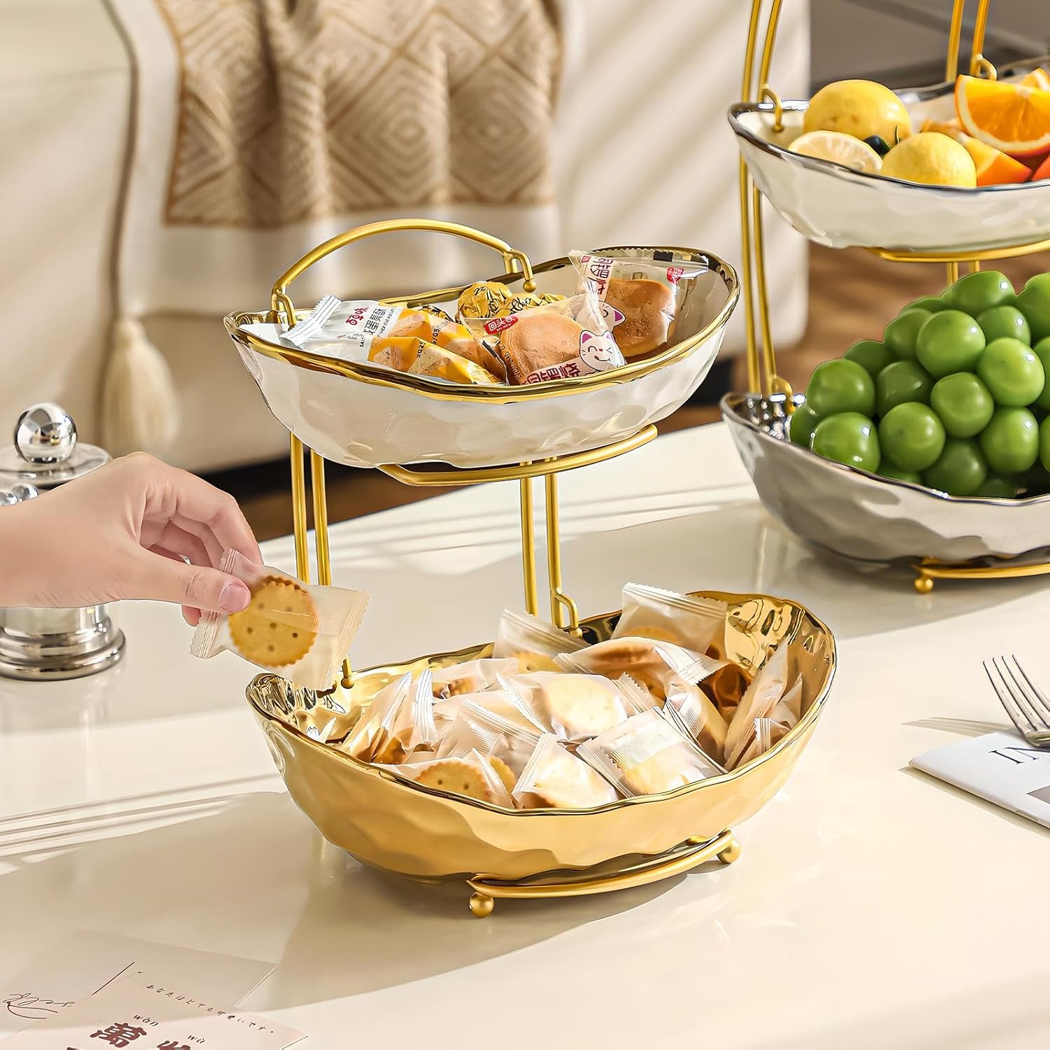 Specification 3 Tier Fruit Bowl Bowl Size: S (Length * Height) - 21cm x 5cm/ 8.3inch x 2inch M (Length * Height) - 24cm x 6cm/ 9.4inch x 2.44inch L (Length * Height) - 26.5cm x 7.5cm/ 10.4inch x 2.9inch Holder Size: 27cm x 21.5cm x 37cm/ 10.63inch x 8.46inch x 14.57inch 2 Tier Fruit Bowl Bowl Size: M (Length * Height) - 24cm x 6cm/ 9.4inch x 2.44inch L (Length * Height) - 26.5cm x 7.5cm/ 10.4inch x 2.9inch Holder Size: 27cm x 21.5cm x 23cm/ 10.63inch x 8.46inch x 9.06inch Features 【3 Tier Fruit Bowl】 This fruit holder combines beauty with practicality, featuring a unique three-tier design with an elegant shape, smooth surface, and graceful lines. It consists of three extra-thick ceramic bowls of varying sizes and a sturdy metal stand, arranged in tiers. 【Extra-Thick Ceramic】 The fruit stand is made of high-quality ceramic and fired at high temperatures. The ceramic fruit bowl is very thick, with a smooth surface and a rich texture. The golden fruit bowl is also made of ceramic and its surface is gold-plated. 【No Assembly Required】 The metal stand, no assembly needed, ready to use out of the box, making it more convenient to place on the kitchen countertop. We use multiple protective packaging to ensure the safe delivery of the products to you. It is the ideal gift for housewarming parties, weddings and anniversaries. Packing: 1 x 2 Tier Fruit Bowl / 1 x 3 Tier Fruit Bowl Note: 1. Manual measuring, please allow 1 ~ 2cm error. 2. Due to the different monitors, the color of the picture and the actual product may have a little difference.